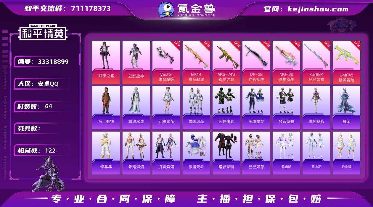 64套装/枪械7/装备122/战备66/热力值28533/三级UMP45-萌骑冒险/七级Vector-绯穹魔姬/五级AKS-74U-森灵之息/五级Kar98K-巳巳如意/五级MK14-福马献瑞/五级DP-28-豹影疾电/五级MG-36-沧焰双生/浪漫天命/暗影哥特/幻影战神/罪夜之冕/UMP45-萌骑冒险/Vector-绯穹魔姬/AKS-74U-森灵之息/Kar98K-巳巳如意/MK14-福马献瑞/DP-28-豹影疾电/MG-36-沧焰双生/炫彩糖果飞行器/绝对恒星降落伞/星穹咏叹调降落伞/魔童闹海 哪吒降落伞/异瞳寒姬降落伞/炫彩糖果降落伞/巳巳如意/荧光像素/雪国风尚/炫彩糖果/马上有钱/紫幽梦/蓝冰羽/云朵鹅/雪绒豹/朱霞炽焰/凌霄紫焰/懒羊羊/敖闰/绯色魅影/画境星梦/琴音绮想/雨过天青/红釉青花/霜纹水星/AUG-冰晶雪宝/AKM-龙的传人/SCAR-L-夜灯/SCAR-L-红色方程式/M416-红色方程式/AUG-耀粉歌者/M762-云朵鹅/M762-登顶巅峰/Mk47-虹云熊熊/蜜獾-天降萌叽/ACE32-画境星梦/ARX-凌霄紫焰/UMP45-夜灯/汤姆逊-像素花束/MP5K-画境星梦/AKS-74U-荧光像素/JS9-凌霄紫焰/P90-巳巳如意/AMR-喜羊羊与灰太狼/SVD-云朵鹅/M1加兰德-画境星梦/S686-生命誓言/S686-巳巳如意/S12K-玩趣呆呆/S12K-夜灯/S12K-极意拳锋/DBS-幻彩电音/AA12-G-画境星梦/SPAS-12-云朵鹅/M249-彩虹符号/M24...