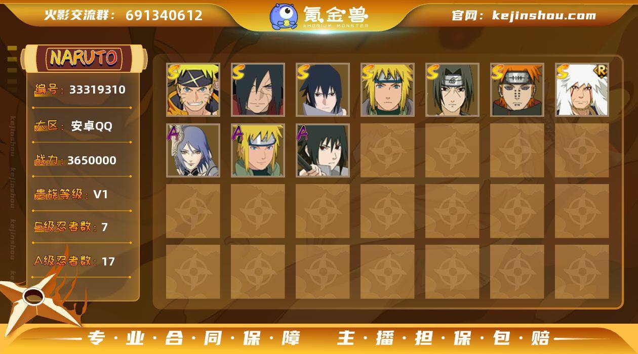 【V1 7S忍 17A忍 86忍 12通灵】7S忍17A忍 365万战力 佩恩·天道,宇智波鼬·须佐能乎,漩涡鸣人·宇智波佐助,宇智波斑·秽土转生·解,波风水门,宇智波佐助·永恒万花筒,自来也·舞之豪杰 宇智波佐助·须佐能乎,黑土·四代目土影,迈特凯,小南·神驹佑将,旗木卡卡西·幻之真容,蝎,猿飞阿斯玛,波风水门·青年,不缘,李洛克·忍界大战,干柿鬼鲛,迈特凯·青春爆炸,宇智波鼬,秋道丁次·忍界大战,宇智波泉奈,千代·近松十人卫,宇智波鼬·夏日限定 德 浮生青 df15-61,编号:WPBJE40