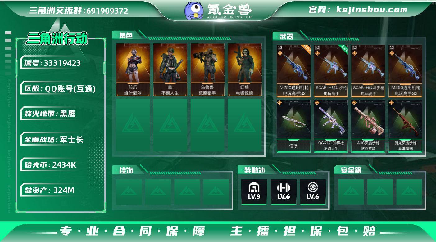 【SJ9840】总资产324M/哈夫币243万/传说近战数1/传说枪皮数33/战场等级24/行动等级60/安全箱等时效性道具以游戏内数据为准,详情请看图/骇爪-维什戴尔/红狼-电锯惊魂/乌鲁鲁-荒原猎手/蛊-不羁人生/近战-信条/近战-处刑者2级/近战-黑鹰/SCAR-H战斗步枪-电玩高手/M250通用机枪-电玩高手S2/优品B典藏武器外观-SCAR-H战斗步枪-电玩高手/极品A典藏武器外观-M250通用机枪-电玩高手S2/M4A1突击步枪-阿米娅/ASh-12战斗步枪-鹅鸭杀/K416突击步枪-行动记录/AUG突击步枪-悠然茶歇/SCAR-H战斗步枪-水墨云图/SCAR-H战斗步枪-启航/G3战斗步枪-骑士/CAR-15突击步枪-阿米娅/腾龙突击步枪-马年祥瑞/腾龙突击步枪-万金泪冠/KC17突击步枪-电锯惊魂/MK47突击步枪-悠然茶歇/P90冲锋枪-信条/Vector冲锋枪-夜莺/UZI冲锋枪-悠然茶歇/勇士冲锋枪-能天使-午夜邮差/勇士冲锋枪-万金泪冠/QCQ171冲锋枪-鹅鸭杀/QCQ171冲锋枪-不羁人生/MK4冲锋枪-夜莺/QJB201轻机枪-鹅鸭杀/Mini-14射手步枪-夜莺/M14射手步枪-蛮荒/M14射手步枪-缄花/SKS射手步枪-骑士/SR-25射手步枪-信条/SR-25射手步枪-缄花/R93狙击步枪-维什戴尔/AWM狙击步枪-万金泪冠/.357左轮-缄花/G18-马年祥瑞/K416突击步枪-冬日风情/K416突击步枪-腊梅/...