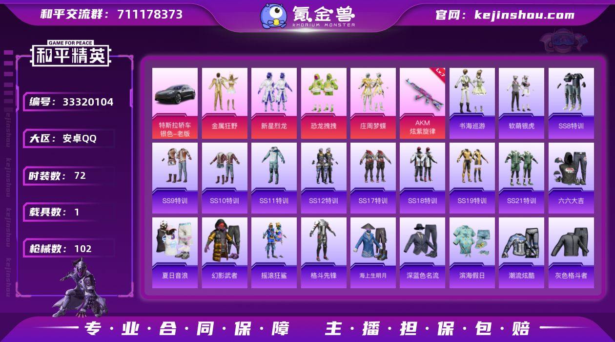安卓 【精品小号 粉装-金属狂野/AKM-炫紫旋律(七级)/特斯拉Model 3(冷光银)/九霄背包(2级)】手Q-4粉装-1特效枪-1载具-3粉色飞行器-31464热力值-3王牌印记-72套装-102枪皮 【粉色套装】:粉装-金属狂野,粉装-新星烈龙,粉装-恐龙拽拽,粉装-庄周梦蝶 【粉色枪皮等级】:AKM-炫紫旋律(七级) 【粉色载具】:特斯拉Model 3(冷光银) 【粉色枪皮】:AKM-炫紫旋律 【粉色飞行器】:天之羽翼飞行器,庄周梦蝶飞行器,星夜魔法师飞行翼 【粉色降落伞】:快乐主宰降落伞,炫紫旋律降落伞,PEL轰鸣竞梦者降落伞,古堡领主降落伞,碧影闪光降落伞,恐龙拽拽降落伞,旋转彩虹降落伞,雪月幻音降落伞 【稀有套装】:套装-雪国风尚,套装-书海巡游 【稀有枪皮】:AKM-灼热熔岩,AKM-破晓战魂,M16A4-夜灯,M16A4-蓝色火焰,SCAR-L-炫彩节奏,SCAR-L-玉兔迎春,SCAR-L-红色方程式,M416-夜灯,M416-红色方程式,M416-绯红前夜,M416-蓝色火焰,GROZA-异彩先驱,AUG-耀粉歌者,QBZ-神秘黑猫,QBZ-飞驰魅影,M762-牛气冲天,G36C-不夜海上花,G36C-冷魅冰骑,G36C-金风玉露,AC-VAL-天降萌叽,蜜獾-娇憨猪猪,UZI-众神之王,UZI-娇憨猪猪,UZI-红色方程式,UMP45-夜灯,UMP45-生命誓言,U...