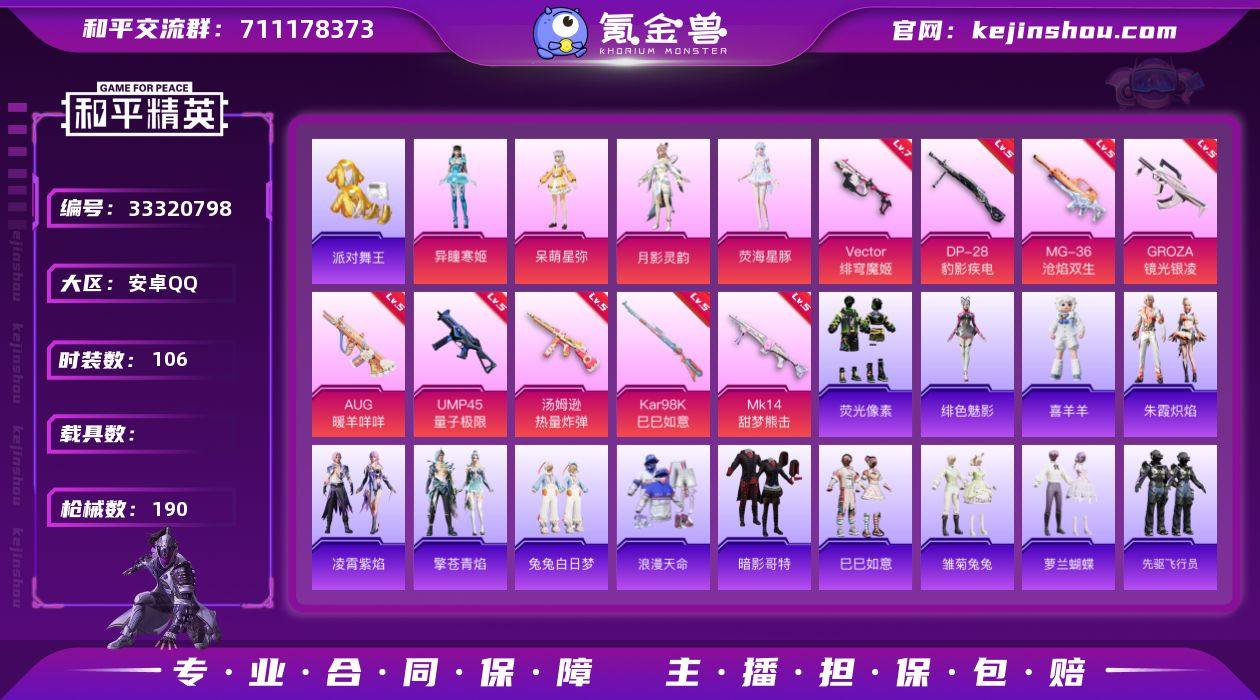 安卓 手Q-4粉装-12特效枪-0载具-1粉色飞行器-48447热力值-7王牌印记-106套装-190枪皮 【热门品类】:套装-浪漫天命,套装-派对舞王,套装-暗影哥特 【粉色套装】:角色-呆萌星弥,角色-月影灵韵,角色-荧海星豚,角色-异瞳寒姬 【粉色枪皮等级】:GROZA-镜光银凌(五级),AUG-暖羊咩咩(五级),UMP45-量子极限(五级),Vector-绯穹魔姬(七级),汤姆逊-热量炸弹(五级),AKS-74U-森灵之息(五级),Kar98K-巳巳如意(五级),Mk14-甜梦熊击(五级),Mk14-福马献瑞(一级),DP-28-豹影疾电(五级),PKM-萌骑夺宝(四级),MG-36-沧焰双生(五级) 【粉色枪皮】:GROZA-镜光银凌,AUG-暖羊咩咩,UMP45-量子极限,Vector-绯穹魔姬,汤姆逊-热量炸弹,AKS-74U-森灵之息,Kar98K-巳巳如意,Mk14-甜梦熊击,Mk14-福马献瑞,DP-28-豹影疾电,PKM-萌骑夺宝,MG-36-沧焰双生 【粉色飞行器】:炫彩糖果飞行器 【粉色降落伞】:星之彼岸降落伞,江南烟雨降落伞,金丰海韵降落伞,月影灵韵降落伞,雪月幻音降落伞,异瞳寒姬降落伞,炫彩糖果降落伞 【稀有套装】:套装-巳巳如意,套装-荧光像素,套装-炫彩糖果,套装-迅捷龙虾,套装-雏菊兔兔,套装-萝兰蝴蝶,套装-先驱飞行员,套装-糖糖葫芦,套装-青团波...