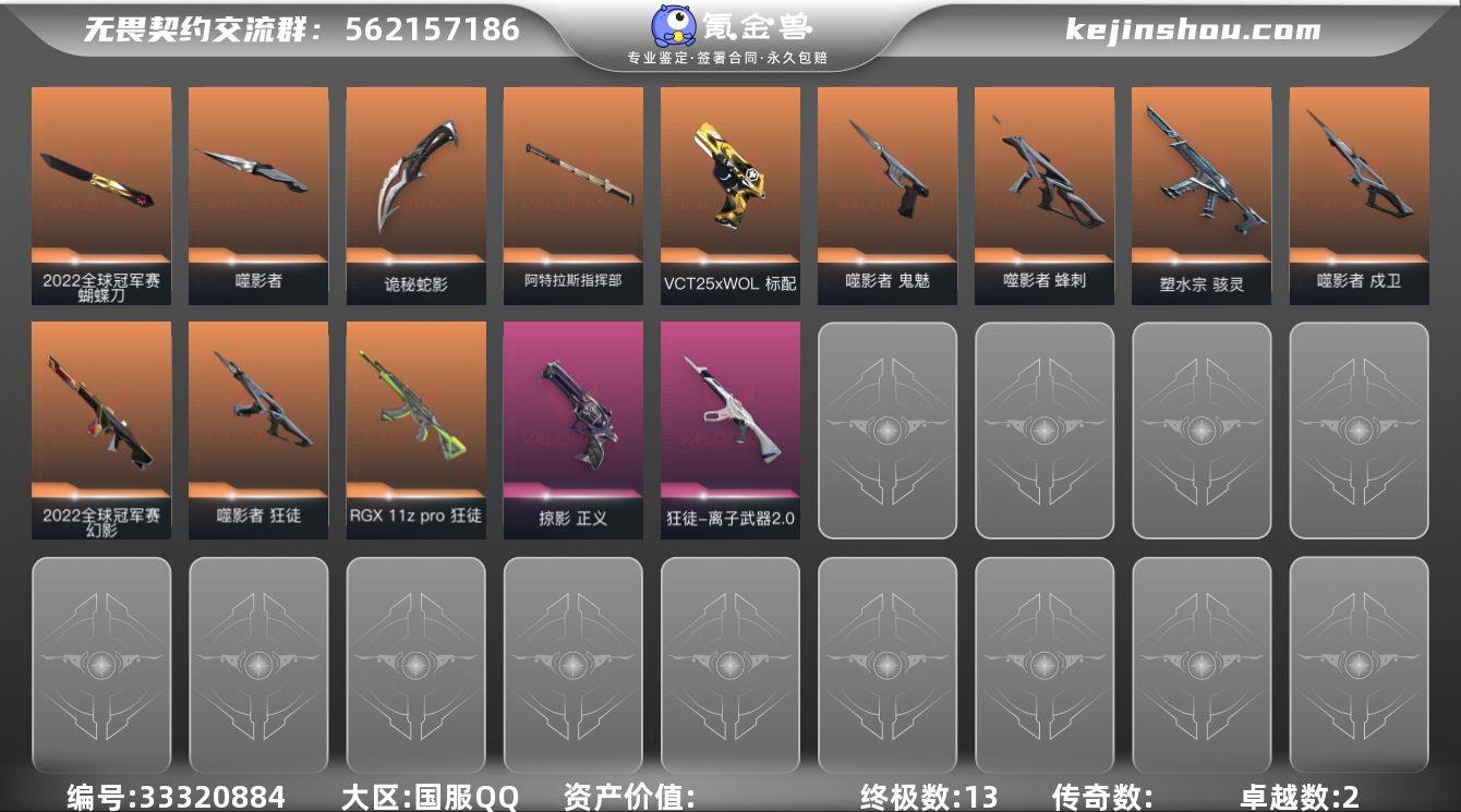 【WWQH503】LV等级134/皮肤总价值26440/段位黄金/总皮肤数量42/刀皮数量5/枪皮数量37/套装数量2/具体详情请看图/2022全球冠军赛/噬影者/幻棱/炼狱/维斯/暮蝶/钛狐/壹决/铁臂/捷风/雷兹/幽影/不死鸟/贤者/猎枭/蝰蛇/零/芮娜/奇乐/尚勃勒/霓虹/斯凯/夜露/星礈/K/O/海神/盖可/黑梦/钢锁/蝴蝶刀-2022全球冠军赛/落英飞旋/噬影者簇刃/诡秘蛇影/阿特拉斯指挥部/狂徒-噬影者/狂徒-RGX 11z pro/狂徒-离子武器2.0/狂徒-诡秘蛇影/幻影-2022全球冠军赛/幻影-末日之翼/戍卫-噬影者/戍卫-折光棱晶/飞将-末日之翼/莽侠-诡秘蛇影/奥丁-末日之翼/判官-诡秘蛇影/骇灵-塑水宗/蜂刺-噬影者/蜂刺-折光棱晶/标配-折光棱晶/标配-VCT25xWOL/正义-掠影/鬼魅-噬影者/鬼魅-诡秘蛇影/短炮-末日之翼/短炮-硬道理/热舞环节 卡面/树懒大作战 卡面/红鳞松叶 卡面/Clutch 卡面/战术熊与伙伴们 卡面/无畏契约GO!第一卷:芮娜 卡面/无畏契约GO!第一卷:零 卡面/《双城之战》金克丝 卡面/无畏契约GO!第一卷:贤者 卡面/别冒尖 卡面/"Luie" 卡面/代号红色 卡面/新兵报到 卡面/V契约 卡面/无畏契约 卡面/审判之爪 喷漆/新潮流 喷漆/买装还是存钱 喷漆/关门放狗 喷漆/酷熊冲浪 喷漆/无畏契约GO!第一卷:贤者 喷漆...