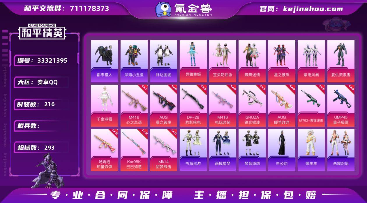 2钻手枪-安卓 手Q-7粉装-14特效枪-0载具-5粉色飞行器-90042热力值-16王牌印记-216套装-293枪皮 【热门品类】:套装-浪漫天命,套装-都市猎人,套装-深海小丑鱼,套装-小丑鱼,套装-胖达圆圆,套装-金羽特工,套装-忍者信条,套装-龟仙人,套装-暗影哥特,角色-8号机,角色-Mark.06 【粉色套装】:粉装-宝贝奶油派,粉装-蝶舞迷情,粉装-星之彼岸,粉装-紫电风暴,角色-复仇流浪者,角色-千金淑猫,角色-异瞳寒姬 【粉色枪皮等级】:M416-心之恋语(七级),M416-电玩时刻(五级),GROZA-镜光银凌(五级),AUG-星之彼岸(六级),AUG-暖羊咩咩(五级),M762-青锋波束(五级),UMP45-量子极限(五级),UMP45-萌骑冒险(四级),汤姆逊-热量炸弹(五级),AKS-74U-森灵之息(四级),Kar98K-巳巳如意(五级),Mk14-甜梦熊击(五级),Mk14-福马献瑞(一级),DP-28-豹影疾电(五级) 【粉色枪皮】:M416-心之恋语,M416-电玩时刻,GROZA-镜光银凌,AUG-星之彼岸,AUG-暖羊咩咩,M762-青锋波束,UMP45-量子极限,UMP45-萌骑冒险,汤姆逊-热量炸弹,AKS-74U-森灵之息,Kar98K-巳巳如意,Mk14-甜梦熊击,Mk14-福马献瑞,DP-28-豹影疾电 【粉色飞行器】:炫彩糖果飞行器,春暖花开飞行器,星之彼岸飞行器 【...