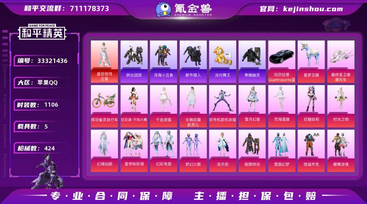 1红48粉30枪3车2马 2级云鸾 雪国 乔克 赵灵儿 紫螳螂 梦幻火箭 都市猎人 金鞋 寒蝎 暗夜之虎 苹果手Q-18王牌印记-1红装-48粉装-30特效枪-5载具-热力值-312套装-424枪皮-13卓越印记-4传奇印记 【1红装】盛世惊鸿-云鸾/2级 【48粉装】套装-精灵娃娃,角色-狂魅哈莉,套装-碧蓝澄空,角色-荧海星豚,角色-洛天依,套装-幻彩电音,角色-时光之吻,套装-极限特训,套装-创世·救赎,女娲后裔-赵灵儿,套装-星穹咏叹调,套装-蝶舞迷情,套装-莲影清波,套装-暗夜鎏金,套装-拂晓神骑,角色-千金淑猫,套装-蜜桃特工,人物-小舞·恋语,套装-第五大道,套装-雪梅暗香,套装-未来歌姬,套装-飒粉甜心,套装-冰霜白皇,套装-灵感创作师,角色-歌者泠鸢,套装-镜光幻境,套装-憨憨奶龙,角色-圣堂之誓,角色-霁蓝缠春,角色-小可学妹,人物-小舞·灵珑,套装-仲夏莫吉托,人物-小舞·雪昙,套装-骨龙祭渊,角色-初号机款机体服,套装-怪诞乔克,套装-梦幻火箭,角色-狂花道·不知火舞,套装-雪月幻音,角色-幻海仙踪,套装-彩虹甜喵,角色-罪夜之冕,角色-绝对恒星,套装-放客神游,套装-相思残雪,套装-垂柳戏鸭,套装-雪国幻梦,套装-炙焰红王 【30特效枪】SCAR-L-灵驹仙姬/3级,P90-金丰海韵/5级,GROZA-精灵之光/3级,SCAR-L-纯梦嫁纱/4级,Mk...