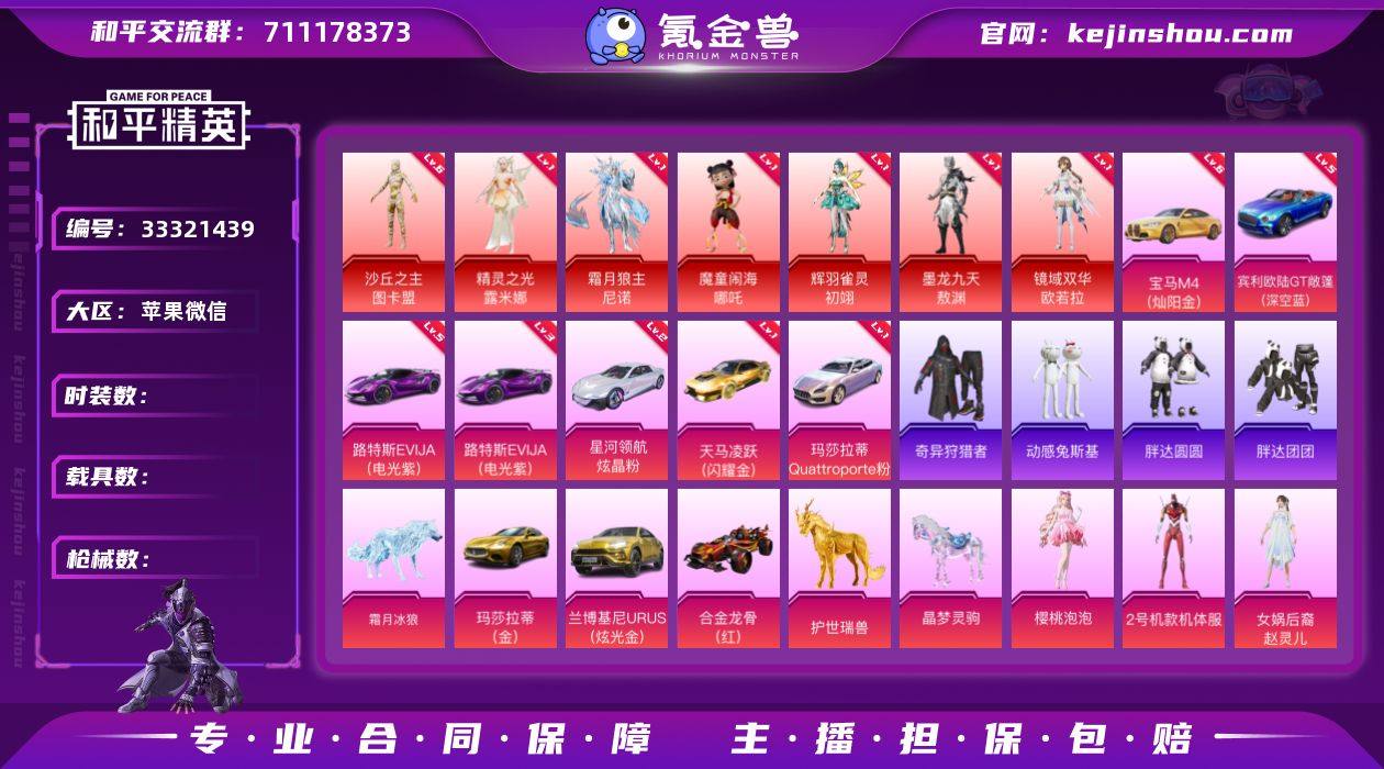 编号63465 果V售后,战神框,22印记,6几图卡盟,尼诺,哪咤,露米娜,欧若拉,敖渊,初翊,天网,木乃伊,赤蝎,金鞋子,金迪迦,三色螳螂,觉醒,小丑,新101,雪国,赵灵儿,巧克力, 黑丝,番茄,猪妹,放客,灵感,狂魅哈莉,白勺,第五大道,2B,飞龙,金鞋子,稻草人,洛天依,小白龙,满级M4,5级欧陆,5级路特斯,2级星河领航,升级玛莎,天马凌跃,瑞兽,冰狼,晶梦灵驹,金玛莎,红蹦蹦,金兰博,满级星梦奇缘,满级超新星,满级灵驹仙姬,圣斗士星矢,精灵之光,盛世惊鸿,天蓬,霜月狼主,辉羽雀灵,圣域龙灵,女蜗灵识,墨龙九天,沙丘之主,境域双华,万古,甜心AK,64特9满15计数22淘汰,21载具双僚机,110粉7红,近36W热力(历史2个7天违规!)