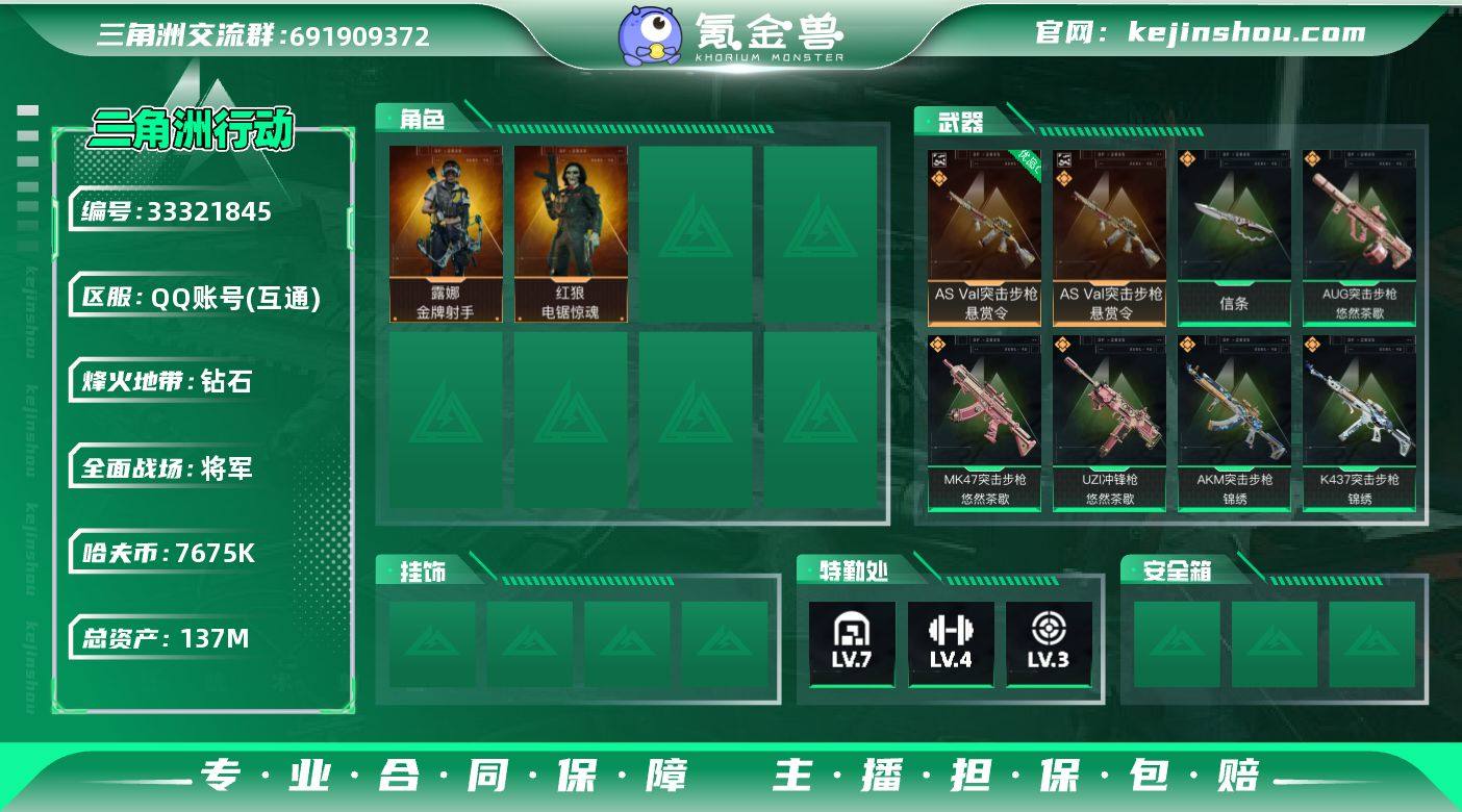 【6159】总资产137M/哈夫币767万/传说近战数1/传说枪皮数17/战场等级50/行动等级60/安全箱等时效性道具以游戏内数据为准,详情请看图/红狼-电锯惊魂/露娜-金牌射手(S7)/近战-信条/近战-处刑者3级/近战-黑鹰/AS Val突击步枪-悬赏令/优品C典藏武器外观-AS Val突击步枪-悬赏令/M4A1突击步枪-蚀金玫瑰/AKM突击步枪-锦绣/AUG突击步枪-悠然茶歇/SG552突击步枪-运动员/AK-12突击步枪-特斯拉线圈/SCAR-H战斗步枪-启航/K437突击步枪-锦绣/KC17突击步枪-电锯惊魂/MK47突击步枪-悠然茶歇/UZI冲锋枪-特斯拉线圈/UZI冲锋枪-悠然茶歇/SMG-45冲锋枪-锦绣/SR-3M紧凑突击步枪-特斯拉线圈/勇士冲锋枪-能天使-午夜邮差/R93狙击步枪-维什戴尔/AWM狙击步枪-万金泪冠/QBZ95-1突击步枪-竞技风/K416突击步枪-冬日风情/M7战斗步枪-百步穿杨/G3战斗步枪-流沙送葬/AS Val突击步枪-百步穿杨/MP5冲锋枪-战术竞备/MP5冲锋枪-竞技风/Vector冲锋枪-猎鳄行动/Vector冲锋枪-百步穿杨/Vector冲锋枪-异域战争/SR-3M紧凑突击步枪-战术竞备/勇士冲锋枪-深海恐惧/MP7冲锋枪-六套之力/725双管霰弹枪-炽焰/PKM通用机枪-阿萨拉特攻/QJB201轻机枪-炽焰/SVD狙击步枪-阿萨拉工艺/M14射手步枪-工业狂潮/M700狙击步枪-百步穿杨...