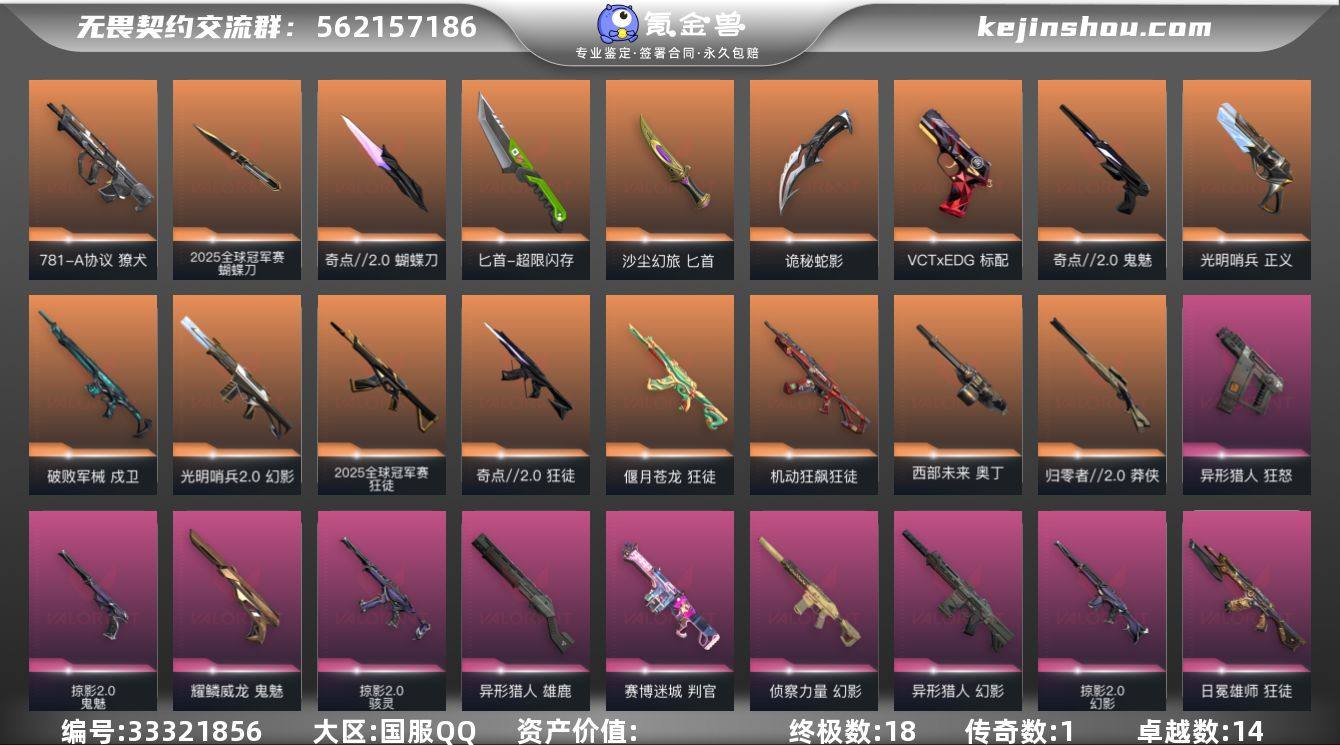 【955958】【套装】:2025全球冠军赛套装,奇点//2.0套装,VCTxEDG 队伍套装,掠影//2.0套装,异形猎人套装 【英雄】:幻棱,炼狱,维斯,暮蝶,钛狐,壹决,铁臂,捷风,雷兹,幽影,不死鸟,贤者,猎枭,蝰蛇,零,芮娜,奇乐,尚勃勒,霓虹,斯凯,夜露,星礈,K/O,海神,盖可,黑梦,钢锁 【近战武器】:近战武器-2025全球冠军赛 蝴蝶刀,近战武器-影钩,近战武器-剥皮小刀,近战武器-奇点//2.0 蝴蝶刀,近战武器-超限闪存 匕首,近战武器-沙尘幻旅 匕首,近战武器-诡秘蛇影 军刀 【狂徒】:狂徒-2025全球冠军赛,狂徒-机动狂飙,狂徒-奇点//2.0,狂徒-偃月苍龙,狂徒-日冕雄师,狂徒-紫阙金琅,狂徒-沙尘幻旅,狂徒-诡秘蛇影 【幻影】:幻影-光明哨兵//2.0,幻影-异形猎人,幻影-侦察力量,幻影-掠影//2.0,幻影-超限闪存,幻影-末日之翼 【戍卫】:戍卫-破败军械,戍卫-浮光跃金,戍卫-萌彩剪影,戍卫-折光棱晶 【獠犬】:獠犬-781-A协议,獠犬-胡桃狂想,獠犬-模拟赫兹 【冥驹】:冥驹-胡桃狂想,冥驹-模拟赫兹 【飞将】:飞将-天界神兵,飞将-沙尘幻旅,飞将-末日之翼 【莽侠】:莽侠-归零者//2.0,莽侠-超限闪存,莽侠-诡秘蛇影 【战神】:战神-浮光跃金,战神-萌彩...
