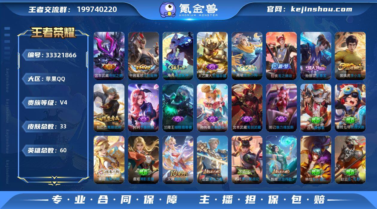 【极品男神打野号·万战金标李信·至尊宝·2传说·低价出售手慢无】苹果Q-V4-至尊星耀IV段位-60英雄-33皮肤-2传说-10史诗 【传说皮肤】:干将莫邪久胜战神,宫本武藏地狱之眼 【限定皮肤】:狄仁杰阴阳师,项羽海滩派对,孙悟空至尊宝,裴擒虎李小龙,沈梦溪龙舞盛年 【赛季限定】:甄姬逆浪荇歌,亚瑟荣光之誓 【战令限定】:周瑜线条小狗 【史诗皮肤】:海月海之女神,太乙真人瓦猫非猫,周瑜线条小狗,狂铁龙之律动,裴擒虎李小龙,狄仁杰鹰眼统帅,阿轲节奏热浪,兰陵王暗隐猎兽者,孙悟空至尊宝,妲己魅力维加斯,孙尚香水果甜心,宫本武藏鬼剑武藏 【其他皮肤】:吕布舞狮寰,鲁班七号班班快跑,桑启线条小狗,虞姬溯影追猎,艾琳鹤鸣心笺,亚瑟荣光之誓,哪吒罗小黑战记,甄姬逆浪荇歌,沈梦溪龙舞盛年,狄仁杰阴阳师,亚瑟死亡骑士,典韦黄金武士,妲己少女阿狸,赵云忍炎影,韩信街头霸王,项羽海滩派对,司空震启蛰,曜归虚梦演,李信灼热之刃 【营地ID】:1593176875