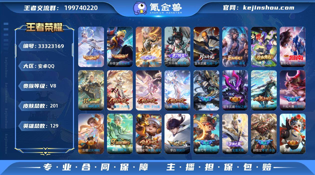 安卓Q-V8-永恒钻石IV段位-129英雄-201皮肤-2典藏皮肤-2无双-4珍品传说-19传说-70史诗【英雄全皮】:刘禅全皮,孙权全皮,鬼谷子全皮,桑启全皮,空空儿全皮【荣耀典藏】:孙悟空全息碎影,伽罗最初的交响【无双皮肤】:曜器灵螭龙剑,公孙离离恨烟【珍品传说】:宫本武藏黑崎一护,张飞兔狲蓬尾,孙策时之奇旅,鲁班七号江户川柯南【传说皮肤】:云缨神骥越千峰,狄仁杰神骥赴朔漠,后羿神树通天,女娲愿照千秋盛,澜愿照九州拓,虞姬愿照岁时盈,云缨幻光神枪,嬴政玄雷天君,桑启鸣野蒿,夏侯惇霜北刀,赵云乘龙铭钟鼎,鲁班七号时之奇旅,李白诗剑行,不知火舞绯月行,鲁班七号寅虎瑞焰,虞姬启明星使,孙悟空零号赤焰,梦奇胖达荣荣,宫本武藏地狱之眼【限定皮肤】:公孙离离恨烟,夏侯惇霜北刀,暃埋骨钱,蒙犽顽岩魄,姜子牙天穹之誓,狄仁杰阴阳师,赵云皇家上将,赵云百木心枪,鲁班七号寅虎瑞焰,鲁班七号时之奇旅,高渐离玩趣恶龙,元歌无心,狄仁杰魔术师,狄仁杰万华元夜,达摩沙漠行僧,项羽海滩派对,老夫子醍醐杖,老夫子航海奇遇记,程咬金演武夺筹,兰陵王金庭之子,不知火舞绯月行,孙悟空零号赤焰,李元芳云中旅人,虞姬启明星使,钟馗驱傩正仪,干将莫邪...