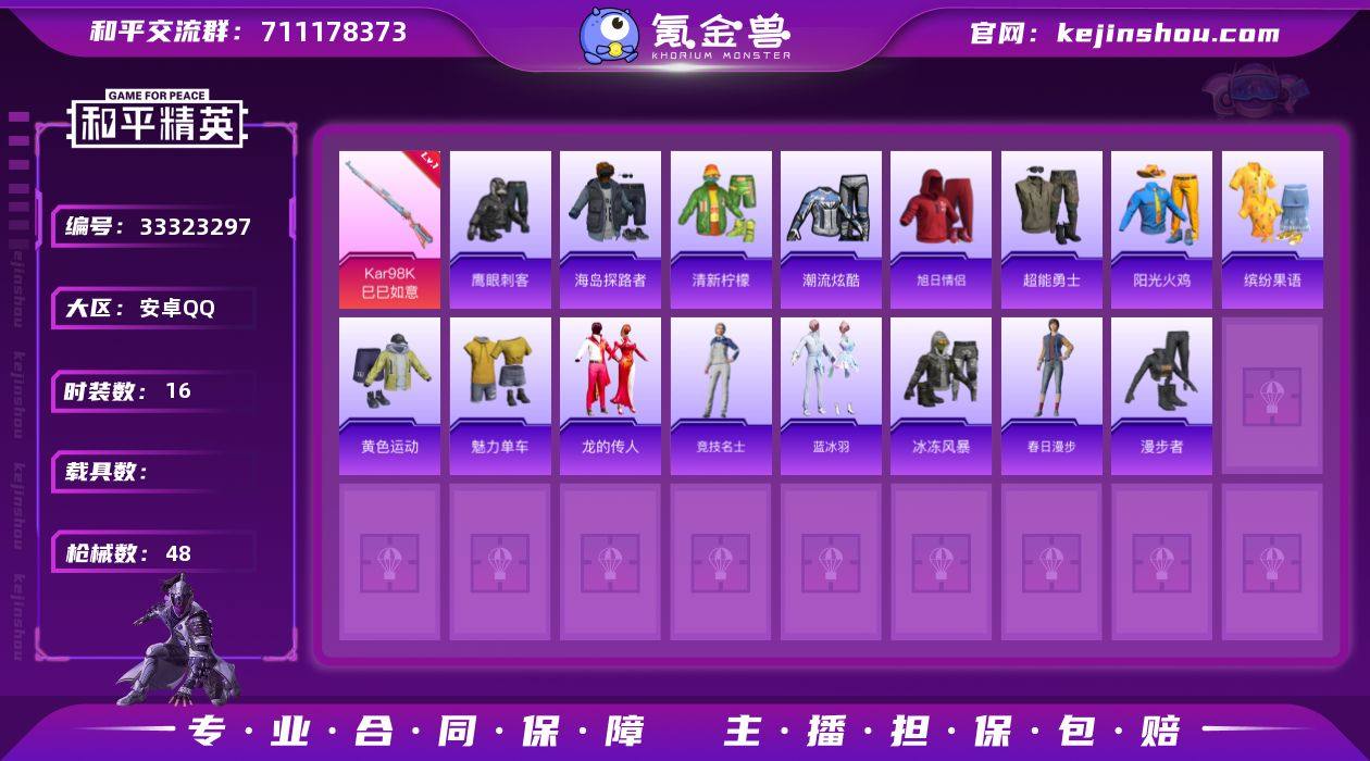 HX9486【地铁天赋43点-4特效枪1王牌印记-素材号】安卓 手Q-0粉装-4特效枪-0载具-0粉色飞行器-11275热力值-1王牌印记-33套装-48枪皮 【粉色枪皮等级】:UMP45-萌骑冒险(三级),AKS-74U-森灵之息(四级),Kar98K-巳巳如意(三级),Mk14-福马献瑞(五级) 【粉色枪皮】:UMP45-萌骑冒险,AKS-74U-森灵之息,Kar98K-巳巳如意,Mk14-福马献瑞安卓Q区-4特效枪-11275热力值-1王牌印记-33套装-48枪皮【特效枪等级】:Kar98K-巳巳如意(三级- Kar98K-巳巳如意)【优质武器皮肤】: Kar98K-巳巳如意【稀有武器皮肤】: Kar98K-巳巳如意 PKM-紫幽梦 Mk14-紫幽梦 蜜獾-乌木金纹 S1897-紫幽梦 P92-紫幽梦 M416-蓝色火焰 AKM-破晓战魂 AKM-龙的传人 SCAR-L-夜灯 GROZA-影袭 AUG-耀粉歌者 Kar98K-影袭 M24-影袭 AWM-天降萌叽 UZI-炫彩节奏 UZI-影袭 UZI-天降萌叽 DBS-彩虹符号 DP-28-彩虹符号 M200-乌木金纹 十字弩-异域银装【其他套装】: 蓝冰羽 龙的传人 潮流炫酷 黄色运动 阳光火鸡 漫步者 竞技名士 旭日情侣 魅力单车 春日漫步 鹰眼刺客 冰冻风暴 超能勇士 海岛探路者 清新柠檬 缤纷果语 老实芭蕉【优质降落伞】: 都市猎人降落伞 普通降落伞