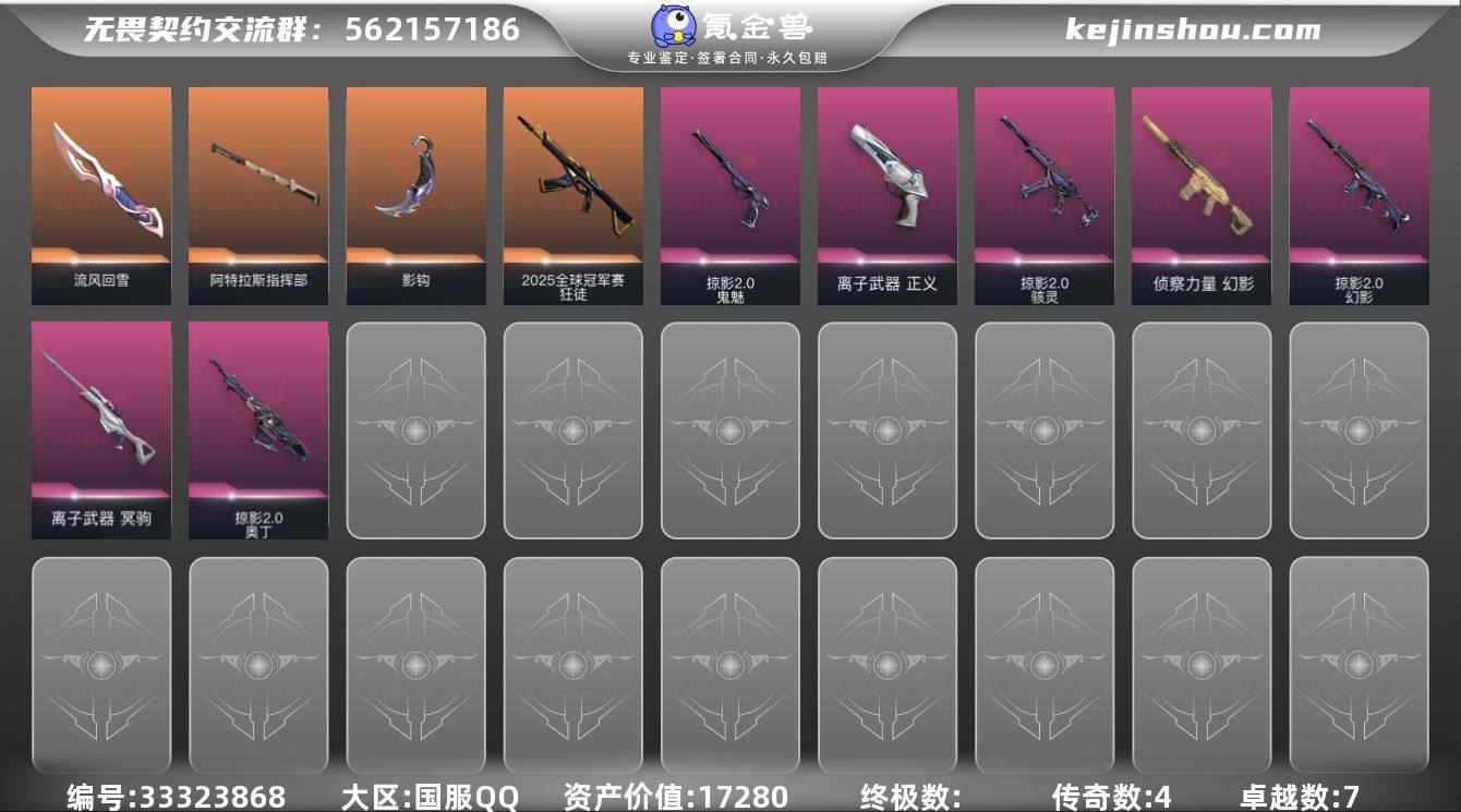 段位: 青铜 套装: 掠影2.0套装 近战武器皮肤: 阿特拉斯指挥部,影钩-掠影2.0,流风回雪-千灵华绽//2.0 步枪皮肤: 幻影-侦察力量,幻影-掠影2.0,2025全球冠军赛 狂徒 佩枪皮肤: 正义-离子武器,鬼魅-掠影2.0 狙击枪皮肤: 冥驹-离子武器 冲锋枪皮肤: 骇灵-掠影2.0 机枪皮肤: 奥丁-掠影2.0 亮点: 【优质装备】:幻影-侦察力量,正义-离子武器,冥驹-离子武器,阿特拉斯指挥部,影钩,2025全球冠军赛 狂徒