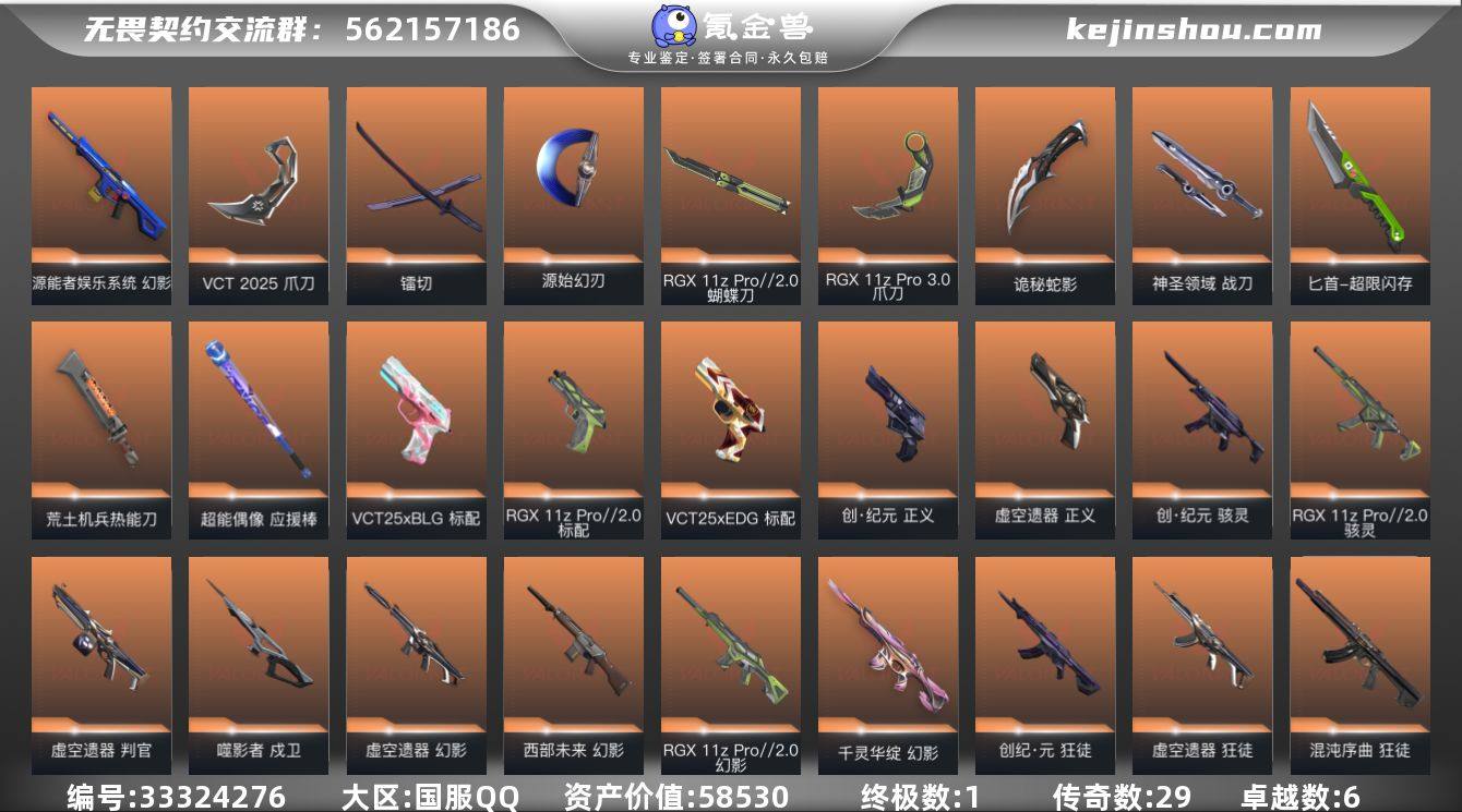 段位: 未定级 套装: 创·纪元套装,VCTCN2025套装,RGX 11z Pro//2.0,VCT 2025赛季礼包,虚空遗器 近战武器皮肤: 超能偶像 应援棒,爪刀-RGX 11z Pro 3.0,匕首-超限闪存,荒土机兵热能刀,镭切-创·纪元,神圣领域 战刀,RGX 11z Pro//2.0 蝴蝶刀,VCT 2025 爪刀,源始幻刃-虚空遗器,诡秘蛇影 步枪皮肤: 狂徒-紫阙金琅,狂徒-盖亚的复仇,狂徒-盖世英雄,狂徒-塑水宗,狂徒-堕天遗武,幻影-千灵华绽,幻影-源能者娱乐系统,狂徒-混沌序曲,狂徒-掠影,狂徒-创·纪元,幻影-RGX 11z Pro//2.0,幻影-西部未来,幻影-虚空遗器,狂徒-虚空遗器,戍卫-噬影者 佩枪皮肤: 鬼魅-耀鳞威龙,正义-创·纪元,标配-VCT25xEDG,标配-VCT25xBLG,标配-RGX 11z Pro//2.0,正义-虚空遗器,蒙太奇 狂怒 狙击枪皮肤: 莽侠-创·纪元,冥驹-RGX 11z Pro//2.0 冲锋枪皮肤: 骇灵-创·纪元,骇灵-RGX 11z Pro//2.0 霰弹枪皮肤: 判官-虚空遗器 亮点: 【优质装备】:狂徒-塑水宗,幻影-千灵华绽,幻影-源能者娱乐系统,狂徒-混沌序曲,狂徒-掠影,狂徒-紫阙金琅,狂徒-盖亚的复仇,狂徒-盖世英雄,爪刀-RGX 11z Pro 3.0,匕首-超限闪存,荒土机兵热能刀,镭切,神圣领域 战刀,RGX 11z Pro//2.0 蝴蝶刀,VCT 2025 爪刀,源始幻刃,诡秘蛇影,鬼魅-耀鳞威龙