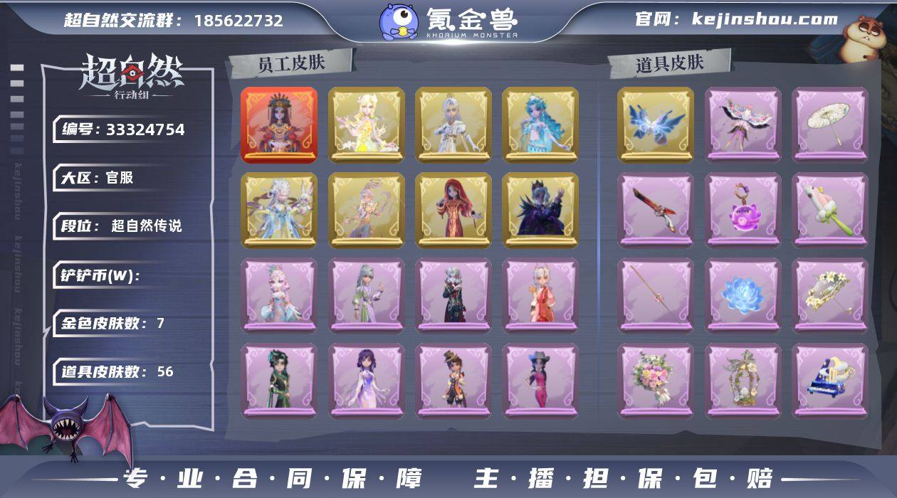 红皮1;金皮7;紫皮16;道具皮56;皮肤:巫铃儿-镜生遗梦,逍遥-剑仙,巫铃儿-镜花辞,薇薇安-海月息潮,兰-春之声,莉莉-瑶台梦,零-渡鸦公爵,逍遥-莲华渡,薇薇安-仙锋小姐,小黄-呱呱雨衣,艾伦-黎明猎手,阿念-迷途僵宝,零-磨砺成锋,逍遥-万迭云华,爱丽丝-耀眼的你,小满-燕燕于飞,阿念-庆宴绮愿,莉莉-莓果陷阱,爱德华-梵卓之礼,爱丽丝-甜梦派对,临云-织锦云程,巫铃儿-琢玉怀乡,零-青云逸歌,艾伦-绒绒对决;道具:喷气背包-晶澜灵翼,夜视仪-敛花容,铲子-撒拉弗的祷告,铲子-赞萌波板糖,桃木剑-小羊波德莱尔剑,音响-鸣沙鼓,闪光弹-邪恶滚滚猫,长鞭-缚誓之锁,伞-郁金春信,专业手电-花束般的告白,急救包-蔷薇物语,桃木剑-凤鸣九天,长鞭-小狗蛇点点鞭,黄牛能量饮料-珍珠芭乐莓莓,刺刀-紫气东来,传送按钮-逆时审判,除颤仪-弦外之音,桃木剑-绯色遗证,长鞭-飞天绫,刺刀-铂刺与红萼,腰包-红运福虎,喷气背包-云鸢锦绣,夜视仪-金丝眼镜,除颤仪-冰晶般的代价,长枪-罪棘,音响-happy猫,葫芦-海心凝珠,喷气背包-乘风溯雪,铲子-龙鳞,长枪-波塞冬,音响-月光奏鸣曲,夜视仪等