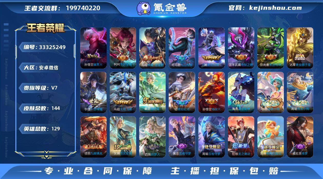 安卓微信区王者荣耀账号出售,可二次实名改名,安全无找回风险! 贵族7等级,总皮肤144款,传说皮肤12款,质量优质! 传说皮肤明细: 阿轲·罗刹望海、达摩·黄金狮子座、澜·逐花归海、马超·无双飞将、李信·一念神魔、孙悟空·地狱火、凯·琥珀纪元、宫本·地狱之眼、司马懿·九山相柳 账号配置齐全,铭文充足,日常排位娱乐都够用,热门传说皮肤多,手感颜值兼备,