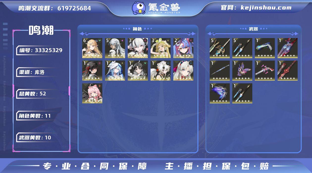 男/女主: 男主 总黄数: 52 联觉等级: 80 拥有五星共鸣者: 鉴心,卡卡罗,安可,维里奈,凌阳,守岸人,椿,珂莱塔,洛可可,卡提希娅,千咲 6鸣五星共鸣者: 6鸣卡提希娅 5鸣五星共鸣者: 5鸣卡卡罗 3鸣五星共鸣者: 3鸣维里奈,3鸣椿 2鸣五星共鸣者: 2鸣洛可可 1鸣五星共鸣者: 1鸣鉴心,1鸣凌阳,1鸣守岸人,1鸣千咲 0鸣五星共鸣者: 0鸣安可,0鸣珂莱塔 拥有五星武器: 千古洑流,星序协响,裁春,死与舞,悲喜剧,血誓盟约,不屈命定之冠,昙切,相位涟漪 5鸣五星武器: 5鸣千古洑流,5鸣血誓盟约 1鸣五星武器: 1鸣千古洑流,1鸣星序协响,1鸣裁春,1鸣悲喜剧,1鸣死与舞,1鸣不屈命定之冠,1鸣昙切,1鸣相位涟漪 亮点: 【MC257】80级/52黄/男主/11个五星角色/10个五星武器未绑定,千咲,卡提希娅,珂莱塔,洛可可,椿,守岸人,维里奈,鉴心,卡卡罗,安可,凌阳,相位涟漪,昙切,不屈命定之冠,血誓盟约,悲喜剧,死与舞,裁春,星序协响,千古洑流,满命卡提希娅,5命卡卡罗,3命椿,3命维里奈,2命洛可可,1命千咲,1命守岸人,1命鉴心,1命凌阳,0命珂莱塔,0命安可,精5血誓盟约,精5千古洑流,精1相位涟漪,精1昙切,精1不屈命定之冠,精1悲喜剧,精1死与舞,精1裁春,精1星序协响,精1千古洑流