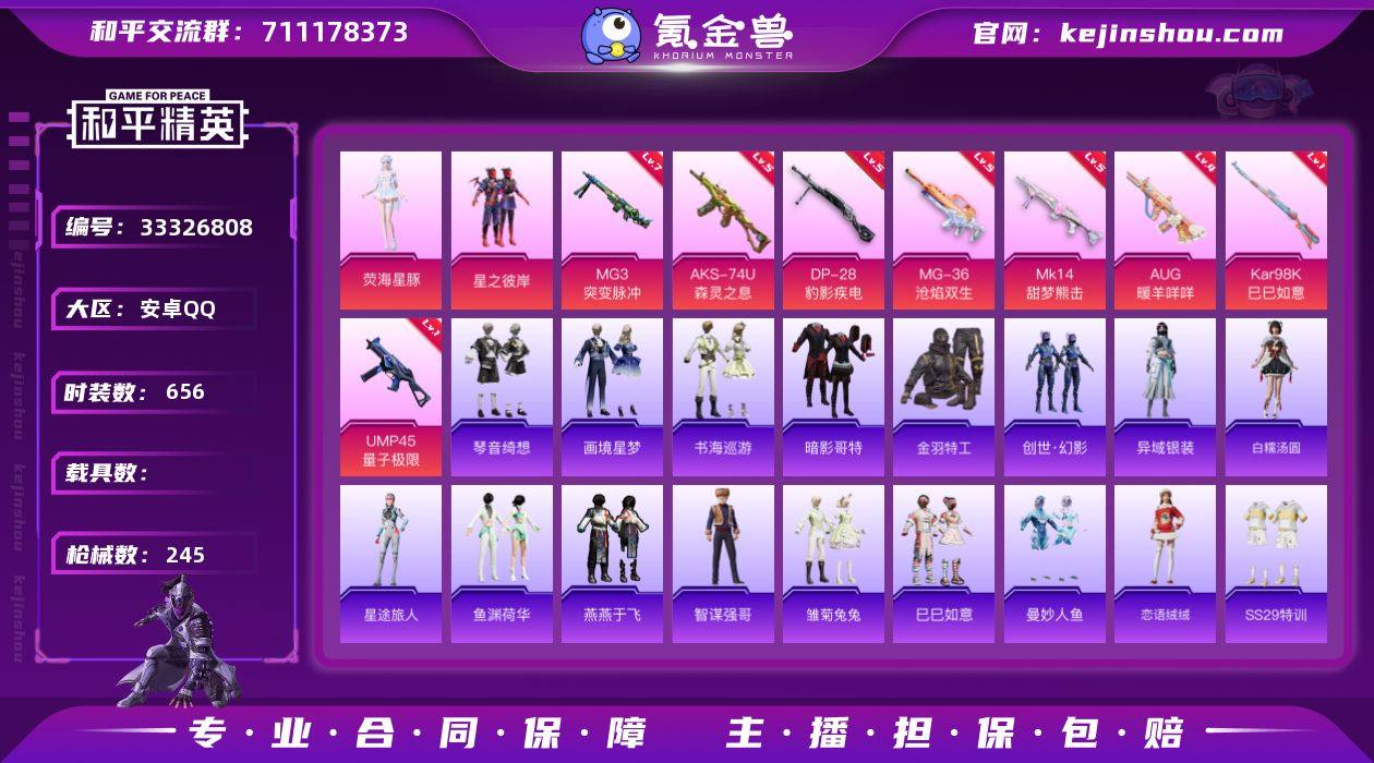【特价出售】安卓Q-1稀有2粉装11特效枪14热门164套装245枪皮 65593热力值 15印记 历史卓越王牌17星 【1稀有】 AWM-黄金龙骨 【2粉装】 荧海星豚 星之彼岸 【11特效枪】 AKS-74U-森灵之息 (5级) Kar98K-巳巳如意 (1级) MG3-突变脉冲 (7级) MG-36-沧焰双生 (5级) DP-28-豹影疾电 (5级) AUG-暖羊咩咩 (4级) UMP45-量子极限 (1级) Mk14-甜梦熊击 (5级) Mk14-福马献瑞 (1级) UMP45-萌骑冒险 (5级) ACE32-萌骑漫游 (4级) 【14热门】 Mark.06 龟仙人 呆萌铁蟹 鹰眼刺客 金羽特工 NV战队服 暗影哥特 团圆交子 瑞龙福将 豚鼠丹丹 漫步者 破蛋小黄鸡 AKM-奇异狩猎者 M762-瑞龙福将 【1飞行器】 庄周梦蝶飞行器