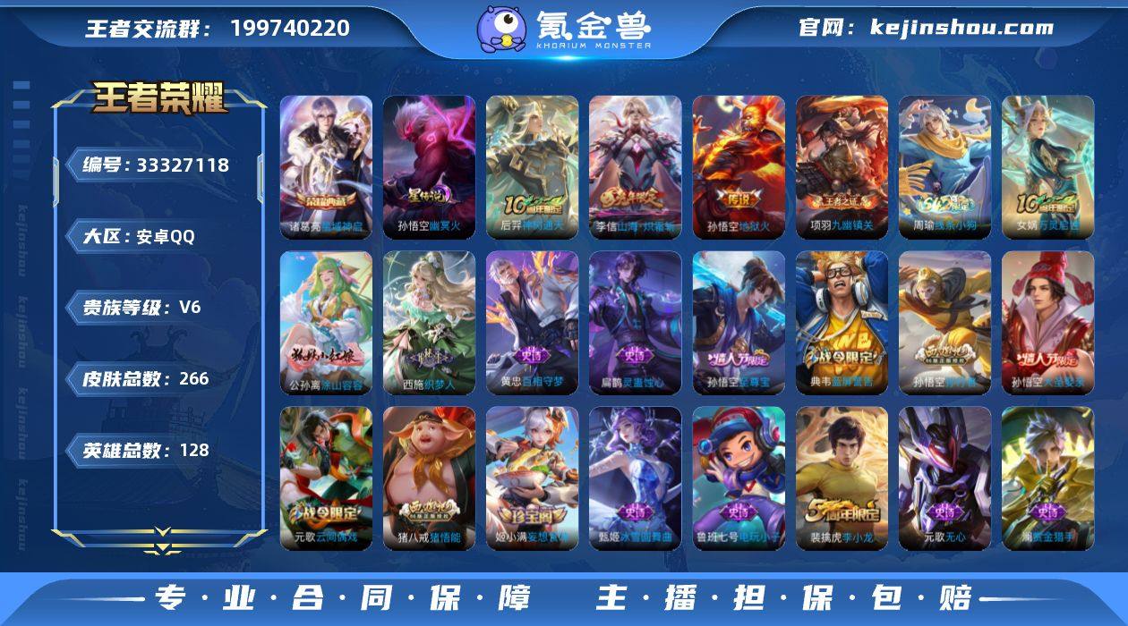 实名: 可修改 性别: 男号 贵族等级: V6 英雄数: 128 皮肤数: 266 荣耀水晶: 星域神启 星传说: 幽冥火 传说皮: 地狱火,山海·炽霜斩,神树通天 限定皮: 遇见飞天,李小龙,游园惊梦,梁祝,至尊宝,大圣娶亲,高山流水,孙行者,猪悟能,五谷丰年
