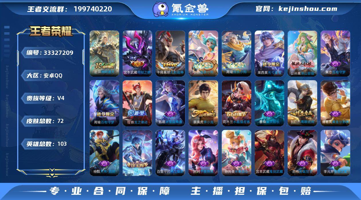 实名: 可修改 性别: 男号 贵族等级: V4 英雄数: 103 皮肤数: 72 传说皮: 久胜战神,地狱之眼,神树通天 限定皮: 李小龙