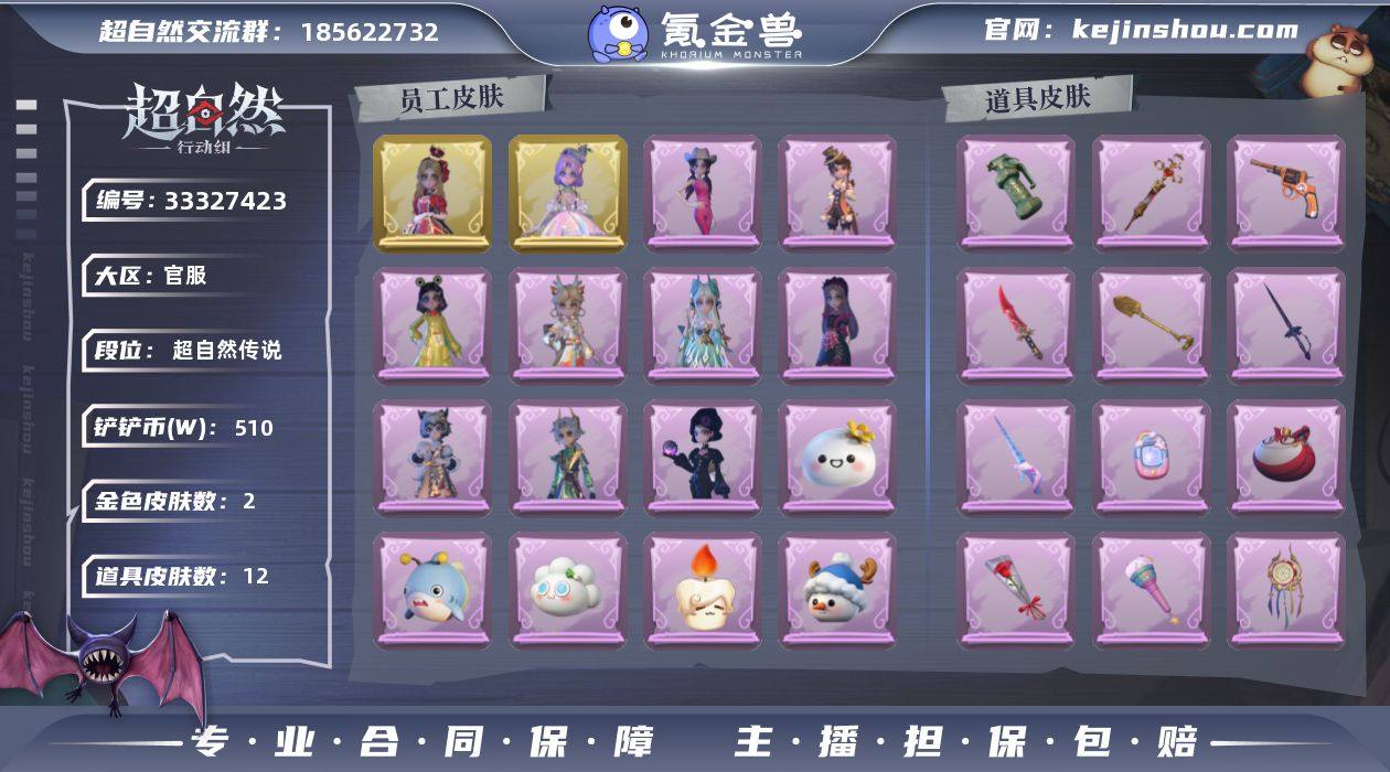 金色皮肤数量: 2 紫色皮肤数量: 9 道具皮肤数量: 12 段位: 超自然传说 外观: 血色中的玛丽,遗失的童话,灵昭鹿鸣,瑞羽衔春,丝缕哀歌,霓裳踏雪,泽引山海,黑月挽歌,嘻嘻头套,烈焰红唇头套,呆滞头套,卑微头套,哈士奇头套,滑稽头套,鱼头怪头套,面具马头套,萨卡班甲鱼头套,驼半仙头套,云梦之星,兔先生的时钟,在逃小新娘,蝶恋花,小鲨包包,未竟乐园,小小玛丽,呱呱雨衣,梵音莲华,火爆了头套,糖果守卫,雪墩墩头套,太空鲨头套,尘封旧事,耀眼的你,庆宴绮愿,烛光纪念,牛啤背包,饺饺者头套,园丁鲨鲨头套,芝麻糊汤圆