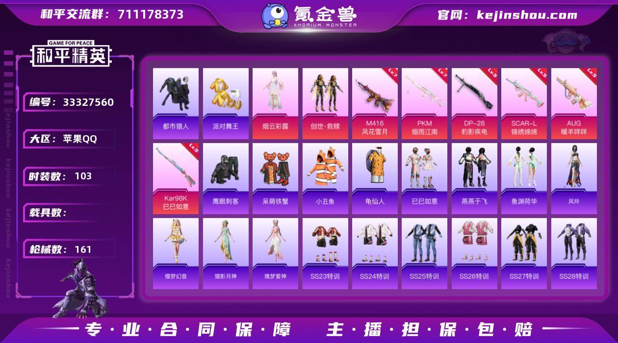 苹果 【枪皮号 300扭蛋碎片SCAR-L-锦绣绵绵(五级)/M416-风花雪月(七级)/AUG-暖羊咩咩(五级)/套装-都市猎人/套装-派对舞王】手Q-2粉装-8特效枪-0载具-1粉色飞行器-42062热力值-5王牌印记-103套装-161枪皮 【热门品类】:套装-都市猎人,套装-派对舞王,套装-小丑鱼,套装-龟仙人 【粉色套装】:角色-烟云彩露,套装-创世·救赎 【粉色枪皮等级】:SCAR-L-锦绣绵绵(五级),M416-风花雪月(七级),AUG-暖羊咩咩(五级),Kar98K-巳巳如意(五级),Mk14-福马献瑞(五级),AA12-G-萌骑幻想(三级),DP-28-豹影疾电(五级),PKM-江南烟雨(七级) 【粉色枪皮】:SCAR-L-锦绣绵绵,M416-风花雪月,AUG-暖羊咩咩,Kar98K-巳巳如意,Mk14-福马献瑞,AA12-G-萌骑幻想,DP-28-豹影疾电,PKM-江南烟雨 【粉色飞行器】:萌物绒绒飞行器 【粉色降落伞】:风花雪月降落伞,猪猪侠降落伞,精灵梦叶罗丽降落伞,智耀战神降落伞,炫彩糖果降落伞 【稀有套装】:套装-龟仙人,套装-巳巳如意,套装-雪国风尚,套装-马上有钱,套装-迅捷龙虾,套装-遗迹猎人,套装-燕燕于飞,套装-鱼渊荷华,角色-风玲,套装-樱梦幻音,角色-猎影月神,角色-瑰梦爱神,套装-雨过天青,套装-红釉青花,套装-燕雀桃枝 【稀有枪皮...