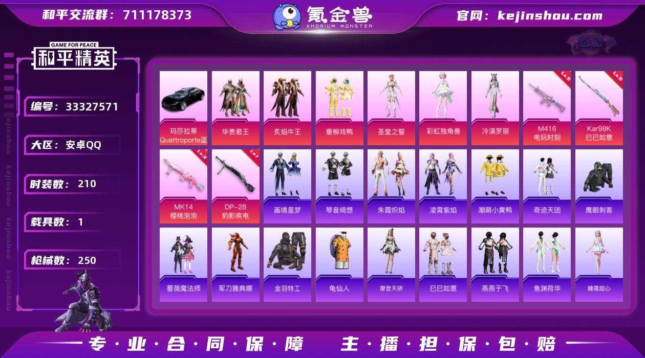 安卓【小号 无敌战神框/M416-电玩时刻(五级)/角色-军刀雅典娜/粉装-炙焰牛王/玛莎拉蒂Quattroporte(夜幕蓝)】 手Q-无敌战神框-6粉装-4特效枪-1载具-2粉色飞行器-79224热力值-14王牌印记-210套装-250枪皮 【热门品类】:角色-军刀雅典娜,套装-金羽特工,套装-龟仙人,套装-潮萌小黄鸭 【粉色套装】:粉装-华贵君王,粉装-炙焰牛王,粉装-垂柳戏鸭,角色-圣堂之誓,角色-彩虹独角兽,角色-冷漠罗丽 【粉色枪皮等级】:M416-电玩时刻(五级),Kar98K-巳巳如意(五级),Mk14-樱桃泡泡(三级),DP-28-豹影疾电(一级) 【粉色载具】:玛莎拉蒂Quattroporte(夜幕蓝) 【粉色枪皮】:M416-电玩时刻,Kar98K-巳巳如意,Mk14-樱桃泡泡,DP-28-豹影疾电 【粉色飞行器】:炫彩糖果飞行器,彩虹独角兽飞行器 【粉色降落伞】:深海曼妙降落伞,幻影战神降落伞,至尊龙雀降落伞,精灵迷巫降落伞,华贵君王降落伞,香水柠檬降落伞,碧影闪光降落伞,绒雪飘舞降落伞,彩虹甜喵降落伞,仲夏莫吉托降落伞,炫光之旅降落伞,精灵梦叶罗丽降落伞,彩虹独角兽降落伞,樱桃泡泡降落伞,炫彩糖果降落伞 【稀有套装】:套装-龟仙人,套装-摩登天骄,套装-巳巳如意,套装-雪国风尚,套装-炫彩糖果,套装-...