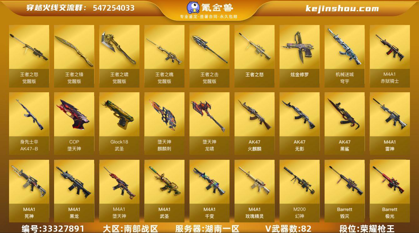 湖南一区-90V-7王者武器数-1炫金武器数 【热门武器】:M200-幻神,死亡之眼,C.A.T,汤姆逊-烈龙*6,RPK-盘龙*6,加特林-炼狱*3,斯泰尔-蝴蝶,COP-堕天神*2,沙鹰-修罗 【王者炫金武器】:王者之怒,炫金修罗 【音效卡】:M200-幻神音效卡 【皮肤】:火麒麟-平天大圣,毁灭耀金皮肤,无影-能量核心,战神-粉色甜心皮肤,战神-紫绶金章皮肤,战神-流金岁月皮肤,AK47-B-常胜将军-曹操*2,AK47-B-常胜将军-刘备,AWM-天龙-传奇白鲨,极光-能量核心 【角色】:葵,零·纪元,战地猎狐,不败狙神,王者-葵-貂蝉,王者涂鸦,乔伊教练,修道士,北极狐-X,嘉年华灵狐,铁骑荣耀,新娜塔莎,潘多拉-N 【人偶武器】:斯泰尔-蝴蝶,巴雷特-零-水下丽影,M37-葵,C.A.T,迷你深渊冰龙*2,迷你牛牛,深渊终结者手雷,闪光弹-小乔,闪光弹-貂蝉,高爆手雷-大乔,迷你艾比,迷你超能女侍 【暴走生化】:死亡之眼 【挑战大师】:神圣爆裂者III 【英雄级武器】:M4A1-千变,AK47-火麒麟,M4A1-黑龙,M4A1-雷神,AK47-无影,M4A1-死神,AN94-超新星,M4A1-武圣,AK47-黑鲨*3,M4A1-堕天神,M4A1-玫瑰精灵,王者之魄-觉醒版,AK-47-猩红传说,AK47-B-战神,AK47-B-常胜将军,机械迷城-穹宇,AK4...