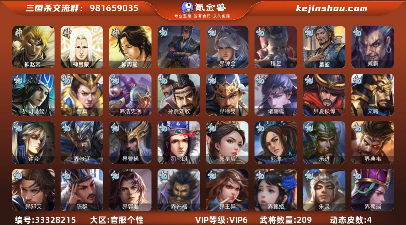 【14790126】官阶:中军将军;VIP等级:VIP6;史诗武将数量:11;动态皮肤数量:4;武将总数:209;史诗宝珠数量:0;将魂数量:1837;神将:1;魏国史诗武将:0;蜀国史诗武将:3;吴国史诗武将:1;群史诗武将:4