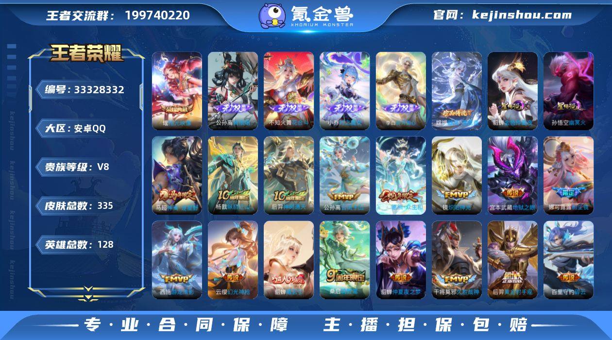 安卓Q-V8-永恒钻石IV段位-128英雄-335皮肤-1典藏皮肤-4无双-1珍品传说-21传说-101史诗 【英雄全皮】:娜可露露全皮,少司缘全皮 【荣耀典藏】:瑶拾光映像 【无双皮肤】:公孙离离恨烟,不知火舞花合斗,小乔时之魔女,李白碎月剑心 【珍品传说】:嫦娥器灵落星盏 【传说皮肤】:马超神骥逐星野,杨戬纵目迁山,后羿神树通天,公孙离云诺千山,妲己愿照众生和,云缨幻光神枪,桑启鸣野蒿,貂蝉曦玄引,东皇太一灼幽烈阳,百里守约碎云,娜可露露前尘镜,孙尚香音你闪耀,蔡文姬花朝如约,西施游龙清影,镜炽阳神光,虞姬启明星使,干将莫邪久胜战神,后羿黄金射手座,貂蝉仲夏夜之梦,宫本武藏地狱之眼,孙悟空地狱火 【限定皮肤】:公孙离离恨烟,蒙犽顽岩魄,大乔绒语心约,姜子牙天穹之誓,狄仁杰阴阳师,赵云皇家上将,墨子神迹守卫,妲己时之奇旅,孙尚香蔷薇恋人,高渐离死亡摇滚,钟无艳超时空战士,扁鹊奇幻香踪,芈月幻夜卜梦,元歌云间偶戏,元歌无心,甄姬幽恒,甄姬落雪兰心,马可波罗山海玄木吟,狄仁杰魔术师,狄仁杰万华元夜,达摩星际陆战队,达摩沙漠行僧,项羽海滩派对,老夫子醍醐杖,老夫子航海奇遇记,程咬金演武夺筹,韩信飞衡,王昭君午后时光,兰陵王...