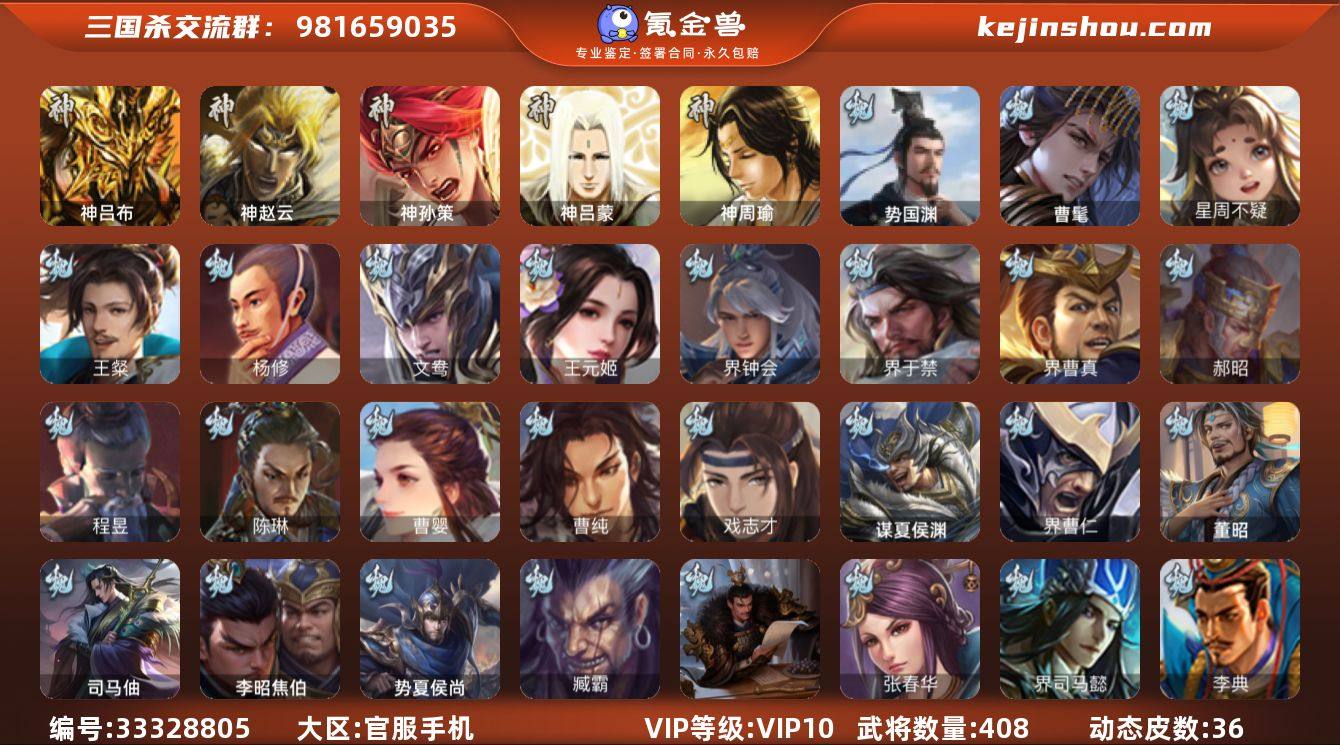【14790125】官阶:大将军;VIP等级:VIP10;史诗武将数量:48;动态皮肤数量:36;武将总数:408;史诗宝珠数量:8;将魂数量:1909;神将:3;魏国史诗武将:7;蜀国史诗武将:9;吴国史诗武将:9;群史诗武将:13