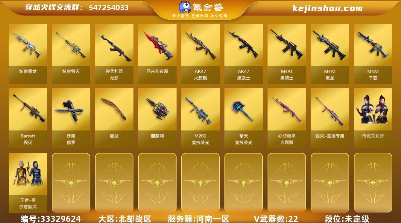 河南一区-24V-0王者武器数-2炫金武器数 【传说角色】:传说艾莉莎 【热门武器】:M200-竞技荣光,M4A1-黑骑士,裁决-雪莉杨,沙鹰-修罗,金刚伞 【王者炫金武器】:炫金黑龙,炫金毁灭 【音效卡】:屠龙-电竞之星-竞星跃动音效卡 【皮肤】:火麒麟-心动糖果,毁灭-直播专属,毁灭-英雄计划 皮肤,麒麟刺-甜蜜糖果 皮肤 【角色】:王者葵-惊若翩鸿,幻面灵狐,初恋灵狐,芳心审判者,风暴女,虎妞,嘉年华灵狐,娟娟,葵-赛博朋克,灵狐者-X,灵狐者-黄金海岸,麻雀,女主播,潘多拉-X,潘多拉-甜心教官,斯沃特-X,铁骑荣耀,影武者-X 【人偶武器】:裁决-雪莉杨,AWM-灵狐-15周年嘉年华,迷你深渊冰龙,迷你裂空之翼 【暴走生化】:超级对讲机 【挑战大师】:神圣爆裂者III*2,冰龙粉碎者-白马银枪,激光毁灭者III-白马银枪,VEPR-12-金魔,神圣爆裂者-末日III,阐释者III 【英雄级武器】:M4A1-千变,AK47-火麒麟,M4A1-黑龙,M4A1-黑骑士,AK47-黑武士,无影-神兵利器,Barrett-毁灭*2,M200-竞技荣光,沙鹰-修罗,屠龙,马来剑-夜魔,麒麟刺,擎天-竞技荣光,屠龙-电竞之星,高爆手雷-夜魔,高爆手雷-竞技荣光,闪光弹-夜魔,闪光弹-竞技荣光*2,烟雾弹-夜魔,烟雾弹-竞技...