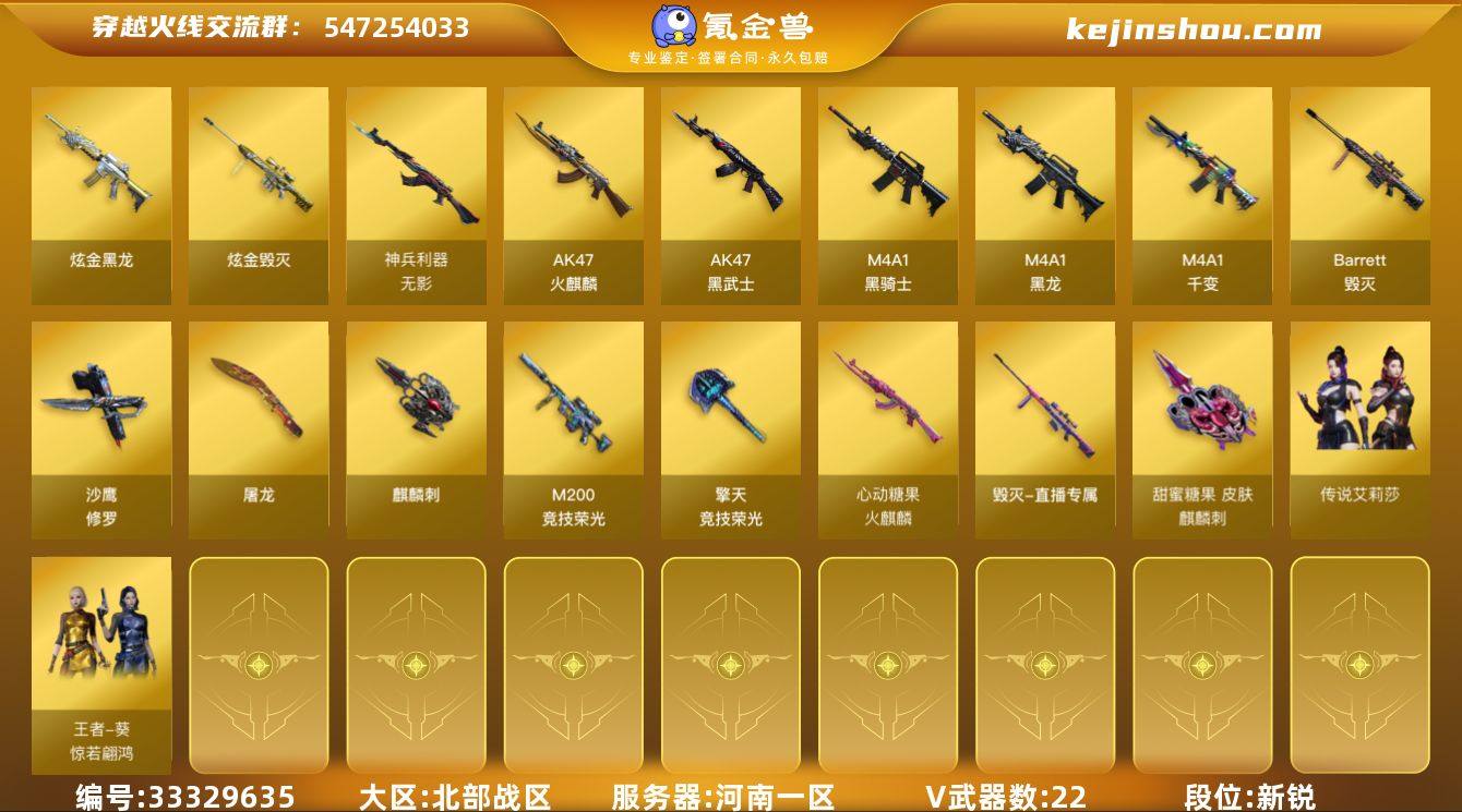 河南一区-24V-0王者武器数-2炫金武器数 【传说角色】:传说艾莉莎 【热门武器】:M200-竞技荣光,M4A1-黑骑士,裁决-雪莉杨,沙鹰-修罗,金刚伞 【王者炫金武器】:炫金黑龙,炫金毁灭 【音效卡】:屠龙-电竞之星-竞星跃动音效卡 【皮肤】:火麒麟-心动糖果,毁灭-直播专属,毁灭-英雄计划 皮肤,麒麟刺-甜蜜糖果 皮肤 【角色】:王者葵-惊若翩鸿,幻面灵狐,初恋灵狐,芳心审判者,风暴女,虎妞,嘉年华灵狐,娟娟,葵-赛博朋克,灵狐者-X,灵狐者-黄金海岸,麻雀,女主播,潘多拉-X,潘多拉-甜心教官,斯沃特-X,铁骑荣耀,影武者-X 【人偶武器】:裁决-雪莉杨,AWM-灵狐-15周年嘉年华,迷你深渊冰龙,迷你裂空之翼 【暴走生化】:超级对讲机 【挑战大师】:神圣爆裂者III*2,冰龙粉碎者-白马银枪,激光毁灭者III-白马银枪,VEPR-12-金魔,神圣爆裂者-末日III,阐释者III 【英雄级武器】:M4A1-千变,AK47-火麒麟,M4A1-黑龙,M4A1-黑骑士,AK47-黑武士,无影-神兵利器,Barrett-毁灭*2,M200-竞技荣光,沙鹰-修罗,屠龙,马来剑-夜魔,麒麟刺,擎天-竞技荣光,屠龙-电竞之星,高爆手雷-夜魔,高爆手雷-竞技荣光,闪光弹-夜魔,闪光弹-竞技荣光*2,烟雾弹-夜魔,烟雾弹-竞技...