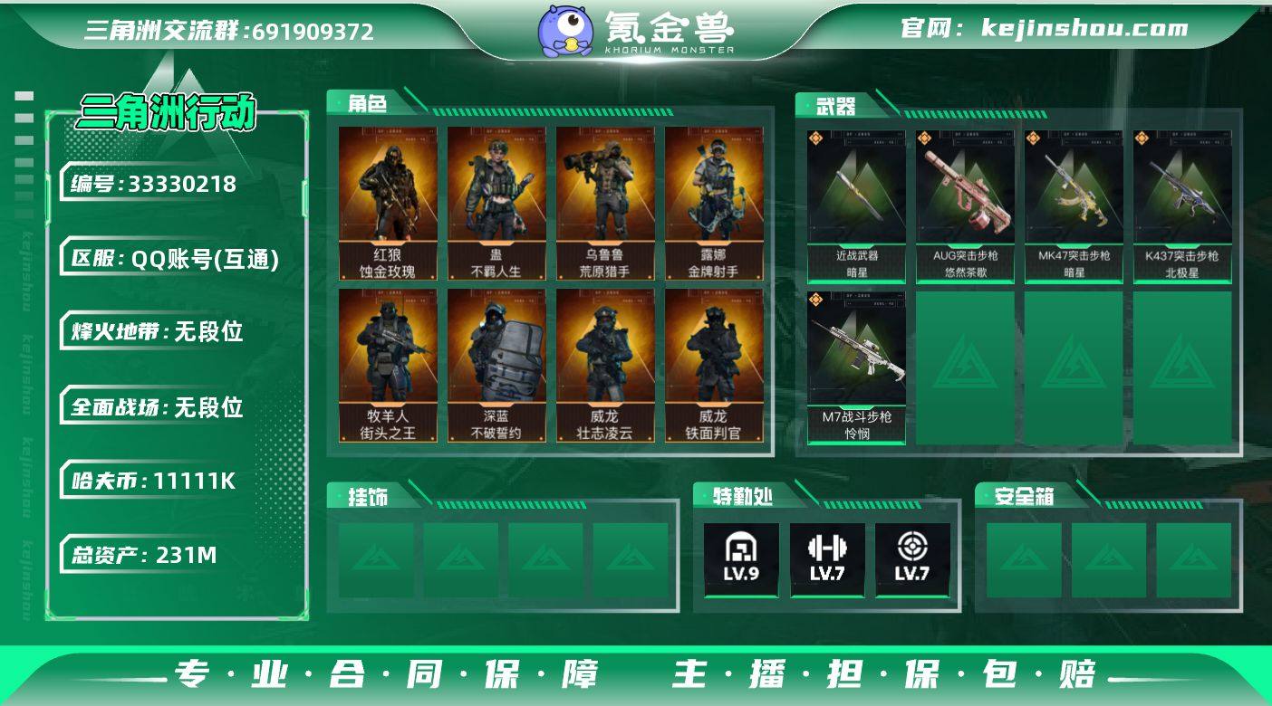 A12813/可二次/QQ区【总资产:230.7M+120AW子弹+巨浪(优品A)+近战怜悯+近战暗星+近战处刑者+红狼蚀金玫瑰+S8赛季2x3】/烽火等级:60级/全面战场:48级/纯币:11111K/三角券加币:773(三角币578+三角券195)【近战-怜悯/近战-暗星/近战-处刑者】【红狼-蚀金玫瑰】【蜂医-无题密令/无名-夜鹰/露娜-金牌射手/乌鲁鲁-荒原猎手/威龙-铁面判官/威龙-壮志凌云/蛊-不羁人生/牧羊人-街头之王/深蓝-不破誓约】/部门:33432/特勤等级(技术中心3级/工作台3级/制药台3级/防具台3级/仓库9级/指挥中心6级/训练中心7级/靶场7级/潜水中心2级/收藏室1级)AK-12突击步枪-夜鹰/AUG突击步枪-悠然茶歇/M4突击步枪-蚀金玫瑰/K437突击步枪-北极星/MK47突击步枪-暗星/M7战斗步枪-怜悯/橙色挂饰x7/段位:黑鹰(流动资产:176.5M)/详细看图