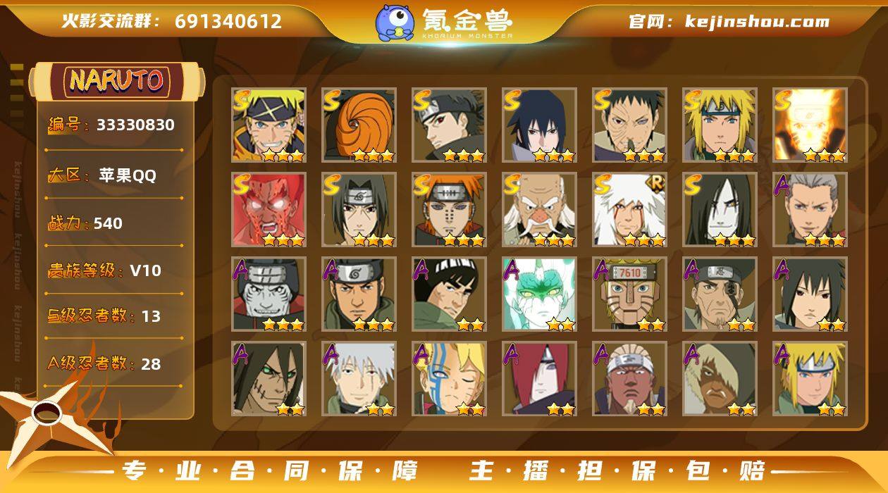 【HYC1796】VIP等级V10/战力540W/S忍数量13/A忍数量28/二星A-旗木卡卡西「忍界大战」/二星A-我爱罗「疾风传」/二星A-达鲁伊「五代目雷影」/二星A-飞段「死司凭血」/二星A-宇智波鼬/三星S-宇智波佐助「永恒万花筒」/二星A-长门「青年」/二星A-迈特凯/三星S-宇智波带土 「忍界大战」/三星A-飞段/二星A-蝎/三星S-佩恩「天道」/三星S-漩涡鸣人·宇智波佐助/三星S-波风水门/三星S-漩涡鸣人 「九喇嘛连结」/二星A-角都「秽土转生」/二星A-漩涡博人「桃式显现」/二星A-旗木卡卡西「万花筒写轮眼」/三星A-干柿鬼鲛/二星A-土台「忍界大战」/二星A-波风水门 「青年」/三星S-自来也「舞之豪杰」/三星S-迈特凯「死门」/二星A-角都「晓创生」/三星S-宇智波止水「须佐能乎」/二星A-奇拉比/二星A-宇智波佐助「万花筒写轮眼」/二星A-宇智波泉奈/二星A-迪达拉/二星A-旗木卡卡西 「幻之真容」/二星A-巳月「仙人模式」/三星S-大蛇丸/二星A-艾 「青年」/三星S-大野木「忍界大战」/三星A-猿飞阿斯玛/二星A-迈特凯「青春爆炸」/二星A-宇智波佐助「须佐能乎」/三星S-宇智波斑「五影会谈」/二星A-机械鸣人「初始形态」/二星A-千代「近松十人卫」/三星S-宇智波鼬 「须佐能乎」