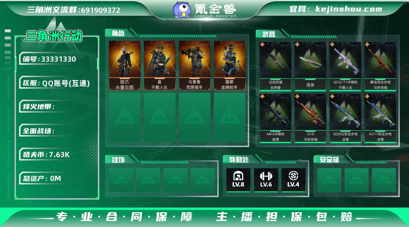 134m总资产-7636k哈夫币-60烽火等级-黑鹰-44战场等级-尉官 【干员外观】:骇爪-水墨云图,露娜-金牌射手,乌鲁鲁-荒原猎手,蛊-不羁人生 【近战皮肤】:近战-信条,近战-处刑者2级,近战-黑鹰 【传说外观】:AKM突击步枪-锦绣,K416突击步枪-行动记录,SG552突击步枪-运动员,SG552突击步枪-点翠,SCAR-H战斗步枪-水墨云图,SCAR-H战斗步枪-启航,腾龙突击步枪-马年祥瑞,K437突击步枪-锦绣,KC17突击步枪-点翠,Vector冲锋枪-夜莺,SMG-45冲锋枪-锦绣,勇士冲锋枪-能天使-午夜邮差,QCQ171冲锋枪-不羁人生,MK4冲锋枪-夜莺,Mini-14射手步枪-夜莺,M14射手步枪-蛮荒,PSG-1射手步枪-点翠,R93狙击步枪-维什戴尔,G18-马年祥瑞 【史诗外观】:AKM突击步枪-林中猎手,K416突击步枪-腊梅,K416突击步枪-阿萨拉特攻,K416突击步枪-缄默情歌,M7战斗步枪-百步穿杨,G3战斗步枪-流沙送葬,AS Val突击步枪-百步穿杨,K437突击步枪-丛影谍踪,KC17突击步枪-缄默情歌,MP5冲锋枪-竞技风,Vector冲锋枪-阿萨拉文明,Vector冲锋枪-百步穿杨,Vector冲锋枪-异域战争,SMG-45冲锋枪-阿萨拉特攻,SR-3M紧凑突击步枪-开工大吉,勇士冲锋枪-丛影谍踪,MP7冲锋枪-六套之力,M1014霰弹枪-林中猎...