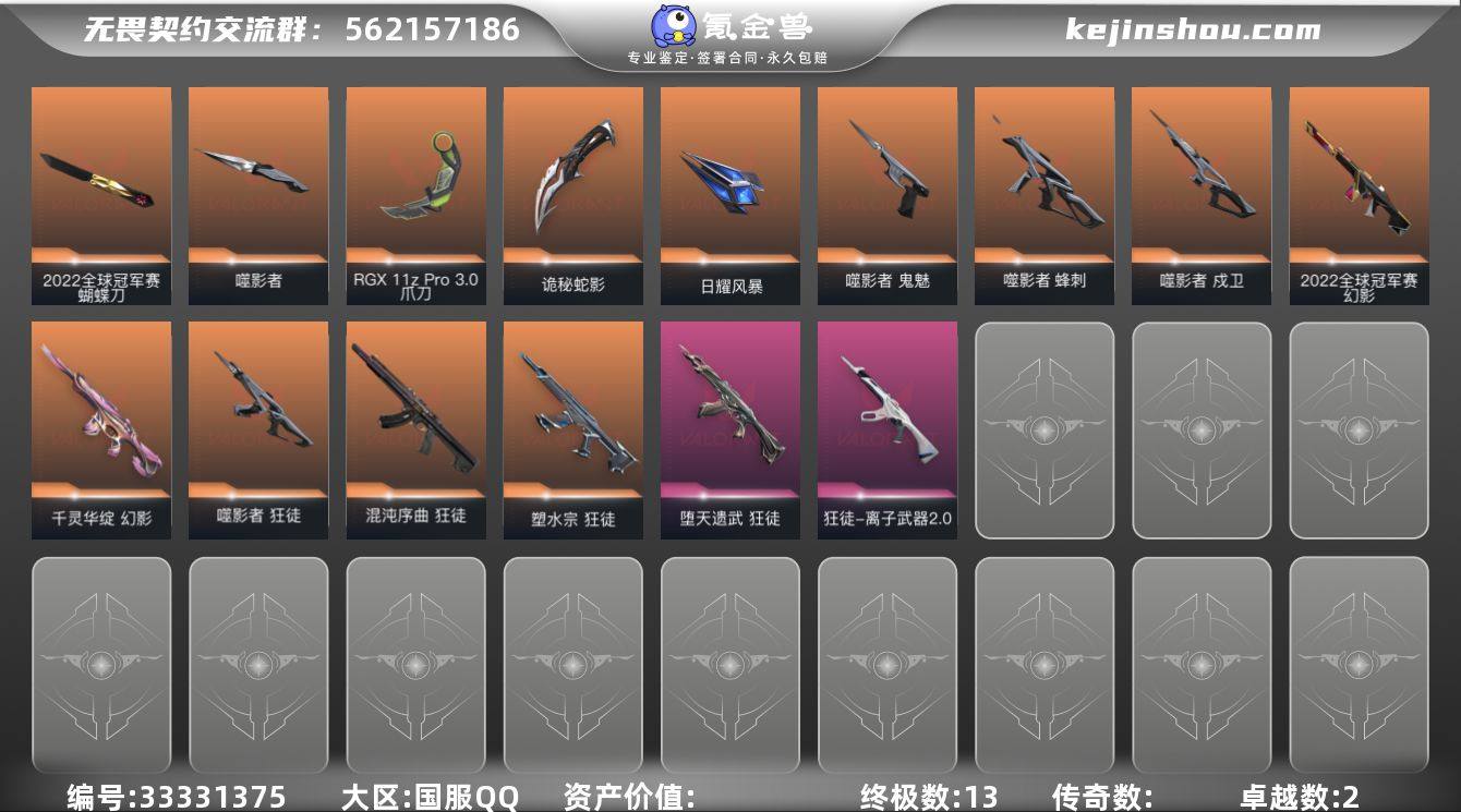 【PTWW3852】LV等级90/皮肤总价值26440/段位未定级/总皮肤数量39/刀皮数量5/枪皮数量34/套装数量2/具体详情请看图/2022全球冠军赛/噬影者/幻棱/炼狱/暮蝶/壹决/捷风/幽影/不死鸟/贤者/猎枭/芮娜/盖可/蝴蝶刀-2022全球冠军赛/爪刀-RGX 11z Pro 3.0/噬影者簇刃/诡秘蛇影/日耀风暴/狂徒-混沌序曲/狂徒-塑水宗/狂徒-噬影者/狂徒-堕天遗武/狂徒-离子武器2.0/狂徒-诡秘蛇影/幻影-2022全球冠军赛/幻影-千灵华绽/幻影-末日之翼/戍卫-噬影者/戍卫-折光棱晶/飞将-末日之翼/莽侠-诡秘蛇影/奥丁-末日之翼/判官-诡秘蛇影/蜂刺-噬影者/蜂刺-折光棱晶/标配-折光棱晶/鬼魅-噬影者/鬼魅-诡秘蛇影/鬼魅-宿怨/短炮-末日之翼/无畏契约GO!第一卷:芮娜 卡面/无畏契约GO!第一卷:零 卡面/代号红色 卡面/新兵报到 卡面/V契约 卡面/无畏契约 卡面/买装还是存钱 喷漆/胜利属于无畏契约 喷漆/GLHF 喷漆/无畏契约 喷漆/深海水族 挂饰 /天外飞客 挂饰/沙尘幻旅 挂饰/无畏契约 纪念币 挂饰