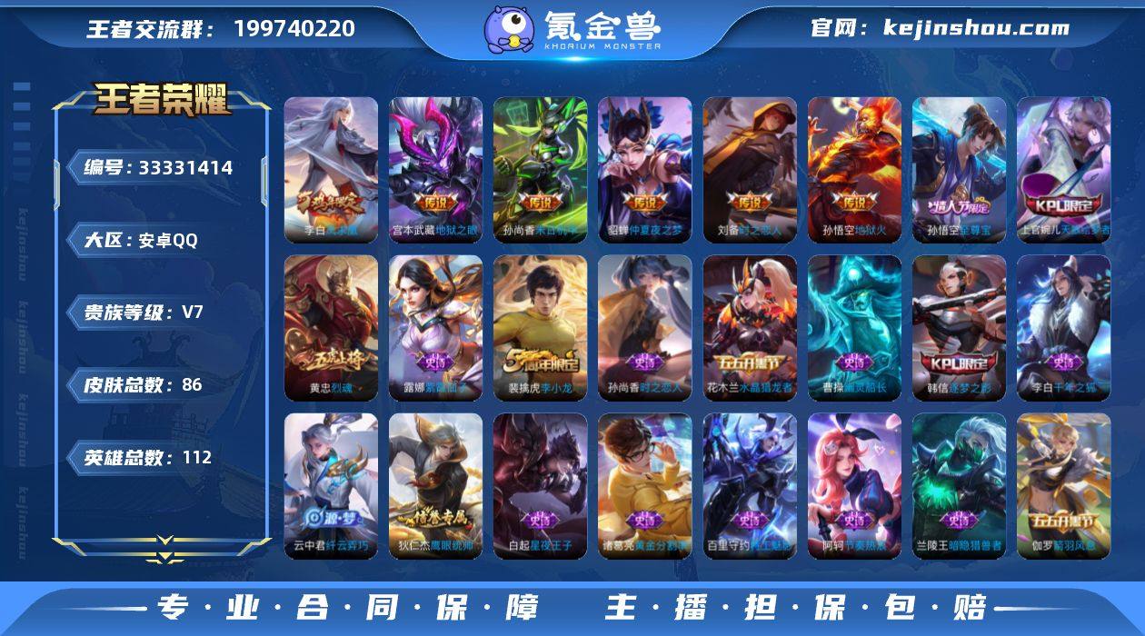 安卓Q-V0-秩序白银II段位-112英雄-86皮肤-6传说-22史诗【传说皮肤】:刘备时之恋人,貂蝉仲夏夜之梦,李白凤求凰,孙尚香末日机甲,宫本武藏地狱之眼,孙悟空地狱火【限定皮肤】:白起狰,狄仁杰阴阳师,虞姬凯尔特女王,赵云皇家上将,孙膑妖精王,扁鹊炼金王,曹操烛龙,典韦穷奇,狄仁杰魔术师,项羽海滩派对,老夫子醍醐杖,韩信逐梦之影,孙悟空至尊宝,雅典娜单词大作战,太乙真人饕餮,鬼谷子原初探秘者,黄忠烈魂,裴擒虎李小龙,狂铁御狮,云中君纤云弄巧,上官婉儿天狼绘梦者【年限皮肤】:李白凤求凰【赛季限定】:孙膑妖精王,扁鹊炼金王,虞姬凯尔特女王,白起狰,太乙真人饕餮,曹操烛龙,典韦穷奇,狂铁御狮,老夫子醍醐杖,鬼谷子原初探秘者,太乙真人谧流熔炉,钟馗虚灵犬护【战令限定】:雅典娜单词大作战【史诗皮肤】:云中君纤云弄巧,裴擒虎李小龙,上官婉儿天狼绘梦者,孙尚香时之恋人,黄忠烈魂,狄仁杰鹰眼统帅,伽罗箭羽风息,阿轲节奏热浪,白起星夜王子,百里守约特工魅影,诸葛亮黄金分割率,兰陵王暗隐猎兽者,韩信逐梦之影,花木兰水晶猎龙者,孙悟空至尊宝,李白千年之狐,曹操幽灵船长,墨子金属风暴,妲己魅力维加斯,狄仁杰魔术师,赵云皇...