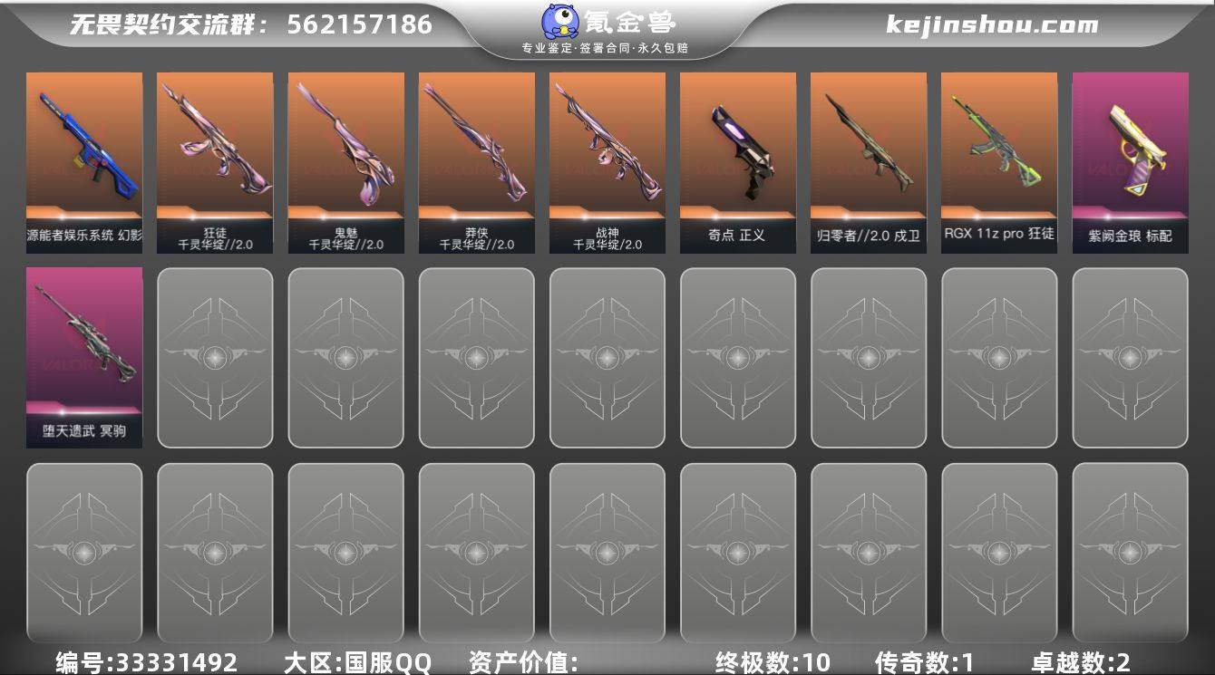 【套装】:千灵华绽//2.0套装【英雄】:炼狱,暮蝶,壹决,捷风,幽影,不死鸟,贤者,猎枭,芮娜,尚勃勒,霓虹,K/O,黑梦【近战武器】:近战武器-碎心裂刃,近战武器-流风回雪,近战武器-鬼丸国纲【狂徒】:狂徒-RGX 11z Pro,狂徒-千灵华绽//2.0【幻影】:幻影-源能者娱乐系统【戍卫】:戍卫-归零者//2.0【冥驹】:冥驹-堕天遗武【莽侠】:莽侠-千灵华绽//2.0【战神】:战神-千灵华绽//2.0【标配】:标配-紫阙金琅【正义】:正义-奇点【鬼魅】:鬼魅-千灵华绽//2.0【卡面】:战术小伙伴的夏日 卡面,无畏契约GO!第一卷:芮娜 卡面,无畏契约GO!第一卷:零 卡面,别冒尖 卡面,代号红色 卡面,新兵报到 卡面,V契约 卡面,无畏契约 卡面【喷漆】:买装还是存钱 喷漆,无畏契约GO!第一卷:贤者 喷漆,暴走萝莉 喷漆,松叶 喷漆,胜利属于无畏契约 喷漆,GLHF 喷漆,无畏契约 喷漆【挂饰】:天外飞客 挂饰,无畏契约 纪念币 挂饰