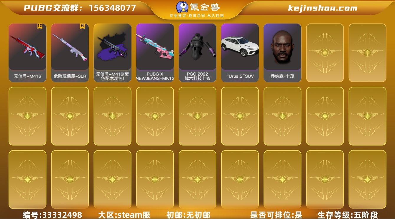 JDPX13801 生存500级可排位/10级无信号-M416/6级危险玩偶屋-SLR/1级G-DRAGON-AUG/1级最后的小夜曲-M24/最后的小夜曲-M24(蓝黑色)/无信号-M416(紫色配木炭色)/兰博基尼suv/紫色魔法烟枪/品红色烟雾弹/黑鬼/丸子头/滑雪镜/渔夫帽/发光手臂/NewJeans-MINJI套装/白熊鞋/Pigff干扰背包/太阳之子电池干扰背包/ 0BFPNW号 无排名, 生存等级2410, 名誉等级4, 金标数量2, 图纸3, 聚合物5424, 枪皮数量146, [成长型] 无信号 - M416[10级], [成长型] G-DRAGON - AUG[1级], [成长型] 危险玩偶屋 - SLR[6级], “Urus S” SUV