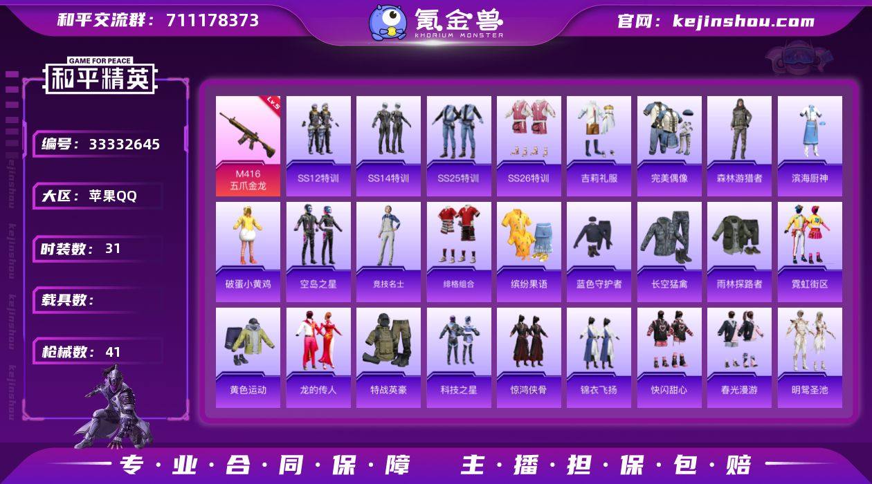 苹果【小号/1特效枪-1粉色飞行器】 手Q--11789热力值-2王牌印记-31套装-41枪皮 【粉色枪皮等级】:M416-五爪金龙(五级) 【粉色枪皮】:M416-五爪金龙 【粉色飞行器】:夜幕颂歌飞行器 【稀有枪皮】:AKM-夜灯,AKM-玄冥寒域,M16A4-幻世战舞者,SCAR-L-炫彩节奏,SCAR-L-红色方程式,M416-糯团青竹,GROZA-治愈之星,M762-牛气冲天,M762-诡娃娃,AC-VAL-快闪甜心,UMP45-炫光之旅,Vector-治愈之星,P90-快闪甜心,M24-治愈之星,Mini14-炫彩节奏,Mk14-治愈之星,M417-惊鸿侠骨,MK20-H-快闪甜心,M200-惊鸿侠骨,S12K-玩趣呆呆,DBS-圣堂之誓,SPAS-12-天使羽翼,M249-彩虹符号,DP-28-彩虹符号,MG3-惊鸿侠骨,沙漠之鹰-快闪甜心,爆炸猎弓-惊鸿侠骨 【其他套装】:套装-SS12特训,套装-SS14特训,套装-SS25特训,套装-SS26特训,套装-吉莉礼服,套装-完美偶像,套装-森林游猎者,套装-滨海厨神,套装-破蛋小黄鸡,套装-空岛之星,套装-竞技名士,套装-绯格组合,套装-缤纷果语,套装-蓝色守护者,套装-长空猛禽,套装-雨林探路者,套装-霓虹街区,套装-黄色运动,套装-龙的传人,套装-特战英豪,套装-科技之星,套装-惊鸿侠骨,套装-锦衣飞扬,套装-快闪甜心,套装-春光...