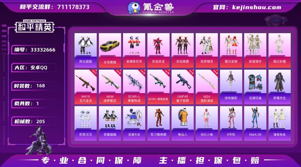 安卓【小号 套装-浪漫天命,套装-胖达圆圆,角色-8号机,角色-Mark.06,SCAR-L-青春物语(五级),M416-五爪金龙(七级),永恒黄蜂】 手Q-7粉装-6特效枪-1载具-3粉色飞行器-70202热力值-13王牌印记-168套装-205枪皮 【热门品类】:粉装-音爆索尼克,套装-浪漫天命,角色-军刀雅典娜,套装-胖达圆圆,套装-龟仙人,套装-粉红小猪,角色-8号机,角色-Mark.06 【粉色套装】:粉装-炙焰赤龙,粉装-赤焰黑爵,粉装-筑梦精灵,粉装-霞光圣骑,粉装-音爆索尼克,粉装-射星猎手,角色-烟云彩露 【粉色枪皮等级】:AKM-绿萝繁花(五级),SCAR-L-青春物语(五级),M416-五爪金龙(七级),M762-青锋波束(五级),UMP45-量子极限(五级),M24-莲影清波(五级) 【粉色载具】:永恒黄蜂 【粉色枪皮】:AKM-绿萝繁花,SCAR-L-青春物语,M416-五爪金龙,M762-青锋波束,UMP45-量子极限,M24-莲影清波 【粉色飞行器】:梦幻火箭飞行器,黄族统领飞行器,萌物绒绒飞行器 【粉色降落伞】:冷魅冰骑降落伞,筑梦精灵降落伞,环太平洋降落伞,精灵梦叶罗丽降落伞,墨龙九天降落伞,忍者神龟降落伞 【稀有套装】:套装-龟仙人,套装-雏菊兔兔,套装-萝兰蝴蝶,套装-小熊娃娃,角色-绯色魅影 【稀有枪皮】:AKM...