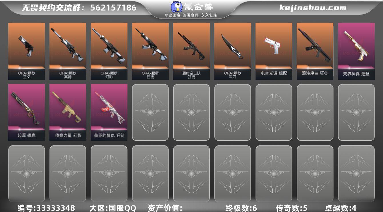 【PTWW3753】LV等级44/皮肤总价值24950/段位铂金/总皮肤数量37/刀皮数量3/枪皮数量34/套装数量1/具体详情请看图/ORAx颗秒/炼狱/维斯/暮蝶/捷风/雷兹/幽影/不死鸟/贤者/猎枭/零/芮娜/尚勃勒/霓虹/K/O/黑梦/近战武器-碎心裂刃/ORAx颗秒 军刀/鬼丸国纲/狂徒-混沌序曲/狂徒-ORAx颗秒/狂徒-超时空卫队/狂徒-盖亚的复仇/幻影-ORAx颗秒/幻影-侦察力量/冥驹-ORAx颗秒/雄鹿-起源/标配-电音光谱/正义-ORAx颗秒/鬼魅-天界神兵/别冒尖 卡面/代号红色 卡面/新兵报到 卡面/V契约 卡面/无畏契约 卡面/无畏契约GO!第一卷:贤者 喷漆/胜利属于无畏契约 喷漆/GLHF 喷漆/无畏契约 喷漆/无畏契约 纪念币 挂饰