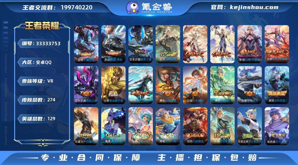 274个皮肤,14个传说皮,92个史诗皮,84个限定29个星元套装两个荣耀典藏116个勇者皮吕布战力8500,拿过两个市标,贵族8最高段位荣耀王者