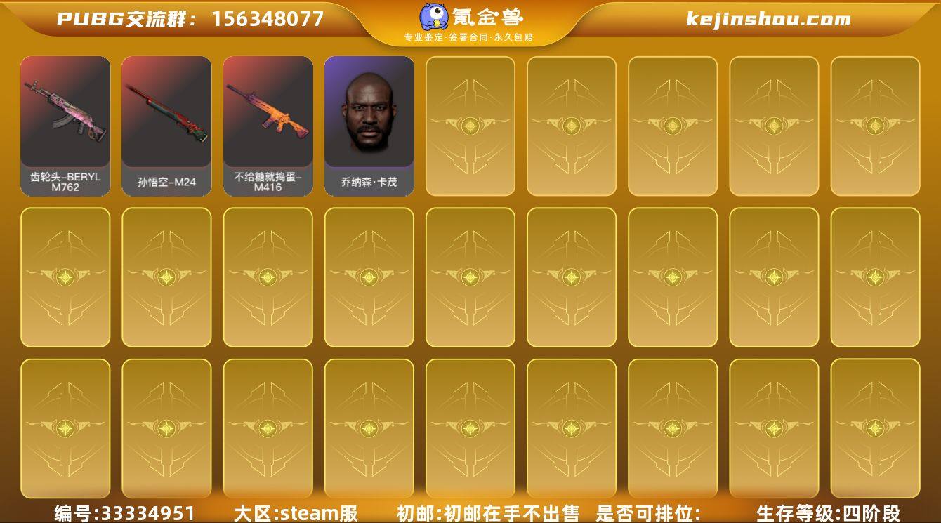 账号来源: 自营 初邮情况: 初邮在手不出售 热门礼包: 拉风龙大礼包 热门装扮: 渔夫帽 热门载具: 阿斯顿马丁跑车 拥有成长型武器: 猛虎猎手-KAR98K