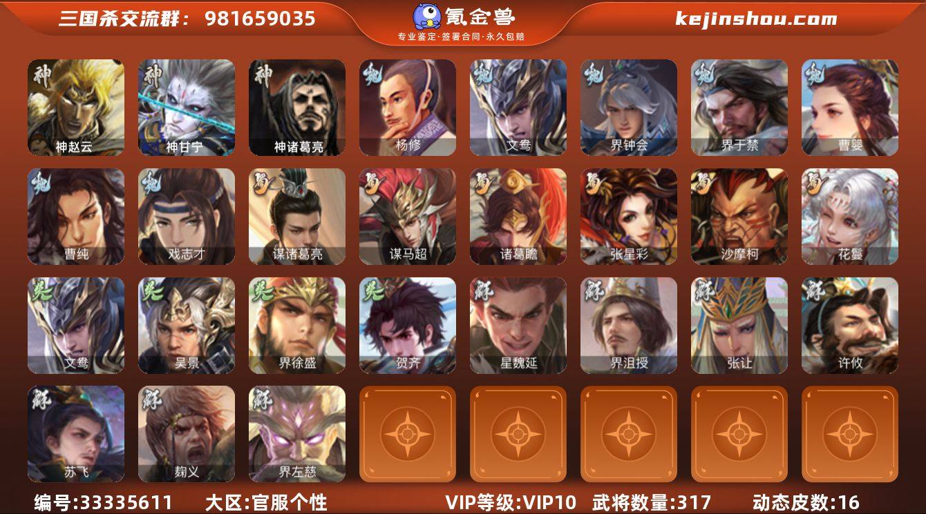 标题:S37172 【支持分期】 VIP等级:VIP10 官阶:骠骑将军 史诗武将数量:29 动态皮肤数量:16 史诗宝珠数量:0 将魂数量:8996 雁翎数量:38220 心愿积分:7941 史诗武将(魏国):文鸯,曹婴,界钟会,戏志才,杨修,界于禁,程昱,曹纯 史诗武将(蜀国):谋诸葛亮,沙摩柯,花鬟,张星彩,诸葛瞻,谋马超 史诗武将(吴国):界徐盛,吴景,贺齐,文鸯 史诗武将(群雄):界左慈,星魏延,许攸,麹义,界沮授,张让,左慈,兀突骨,沮授,苏飞 史诗武将(神将):神甘宁,神赵云