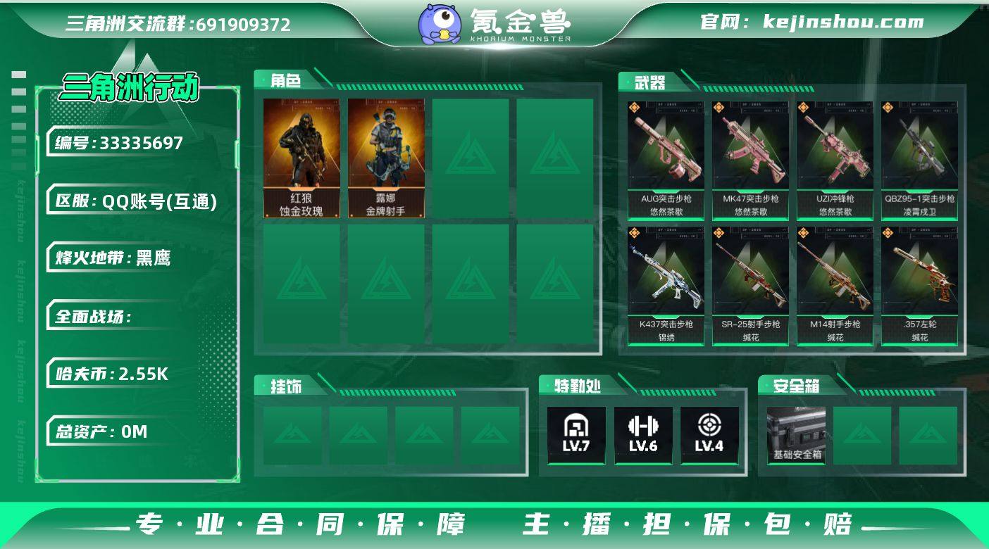 总资产:32.3M,哈夫币:255W;【干员皮肤】红狼蚀金玫瑰,露娜金牌射手,乌鲁鲁荒原猎手,威龙凌霄戍卫;【近战皮肤】近战武器-黑鹰,近战武器-龙牙;【传说枪皮】M4A1突击步枪-蚀金玫瑰,SG552突击步枪-运动员,QBZ95-1突击步枪-凌霄戍卫,K437突击步枪-锦绣,SR-25射手步枪-缄花,M14射手步枪-缄花,.357左轮-缄花,AUG突击步枪-悠然茶歇,MK47突击步枪-悠然茶歇,UZI冲锋枪-悠然茶歇;