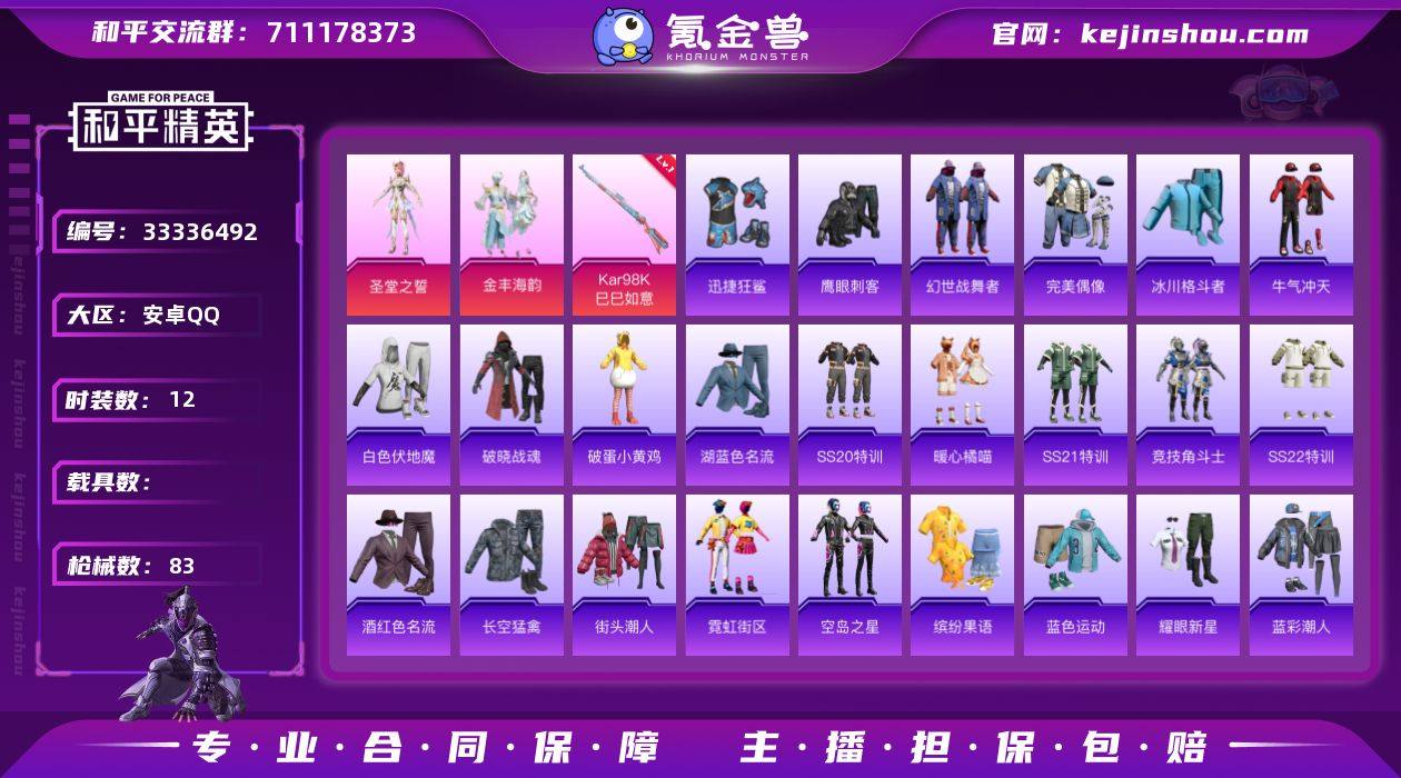 HX9503【粉装-金丰海韵-角色-圣堂之誓-地铁40点天赋-M416-摩登王国-身法素材号】 安卓 手Q-2粉装-1特效枪-0载具-1粉色飞行器-24213热力值-2王牌印记-67套装-83枪皮 【粉色套装】:角色-圣堂之誓,粉装-金丰海韵 【粉色枪皮等级】:Kar98K-巳巳如意(五级) 【粉色枪皮】:Kar98K-巳巳如意安卓Q区-2粉装-1特效枪-24213热力值-2王牌印记-67套装-83枪皮【优质套装】: 圣堂之誓 金丰海韵【特效枪等级】:Kar98K-巳巳如意(五级- Kar98K-巳巳如意)【优质武器皮肤】: Kar98K-巳巳如意【稀有武器皮肤】: DBS-乌木金纹 QBZ-萌萌彩虹球 S1897-精灵梦叶罗丽 SCAR-L-海盐豹豹 TMP-9-霓彩节奏 Kar98K-巳巳如意 蝎式手枪-金丰海韵 Mk14-冰河战士 Vector-突变脉冲 M249-金丰海韵 UZI-冰河战士 平底锅-涂鸦旋风 M16A4-冰河战士 20-H-乌木金纹 M416-红色方程式 M416-蓝色火焰 M416-糯团青竹 M416-摩登王国 AKM-彩虹符号 AKM-破晓战魂 AKM-江南烟雨 AKM-龙的传人 SCAR-L-红色方程式 M16A4-莲影清波 GROZA-绯红回忆 GROZA-影袭 AUG-耀粉歌者 QBZ-未来歌姬 M762-天降萌叽 Mk47-乌木金纹 G36C-六号树人 AC-VAL-天降萌叽 AC-VAL-乌木金纹 蜜獾-天降萌叽 M24-乌木金纹 M24-奇异狩猎者 AWM-音爆索尼克...