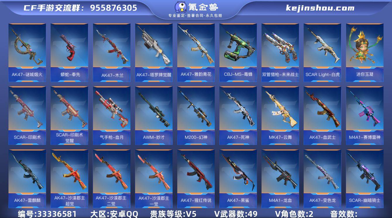 x2371 VIP5级,王心,王影,王兽,王誉,王尊,王蝶,王烈,王霆,王魂,AK奉先,M4星象,AWM妙才,CZS2仲康,审判者,刀锋-枪战王者,关小雨,消灭音效2;【王者武器】:王者之心,王者之影,王者之兽,王者之誉,王者之尊,王者之蝶,王者之烈,王者之霆,王者之魂;【三国武器】:AK47-奉先,M4A1-星象,AWM-妙才,CZS2-仲康,蟒蛇-奉先,CZ75-策,QSZ92-盖,方天画戟,激昂霸王枪;【热门武器】:AK47-火麒麟,AK47-猩红传说,AK47-无影,AK47-沙漠郡主-超觉,AK47-雷麒麟,AK47-变色龙,AK47-雅韵青花,AK47-破空冰刃,AK47-死神,AK47-黑鲨,AK47-血武士,AK47-塔罗牌觉醒,AK47-木兰,M4A1-黑骑士,M4A1-黑龙,M4A1-雷神,M4A1-玫瑰精灵,M4A1-龙血,M4A1-死神,AK47-谜城烟火,M4A1-冰锋觉醒,M4A1-赛博雷神,M4A1-铁胆虎魄,M4A1-机械迷城,M4A1-夏清觉醒,M4A1-运输船,SCAR-幽暗骑士,AN94-四凶觉醒,SCARLight-白虎,SCAR-印刷术觉醒,SCAR-印刷术,SCAR-探星者,9A91-天神,9A91-诛仙四剑,FAMAS-湮灭,AUG-机械纪元,M16-恶魔,M14EBR-拂影,M14EBR-葫芦山庄,M14EBR-天神,QBZ03-死神,QBZ03-金色蔷薇,QBZ03-玉面羞花,AK12-天启,AK103-湮灭,HK417-炎龙铠...