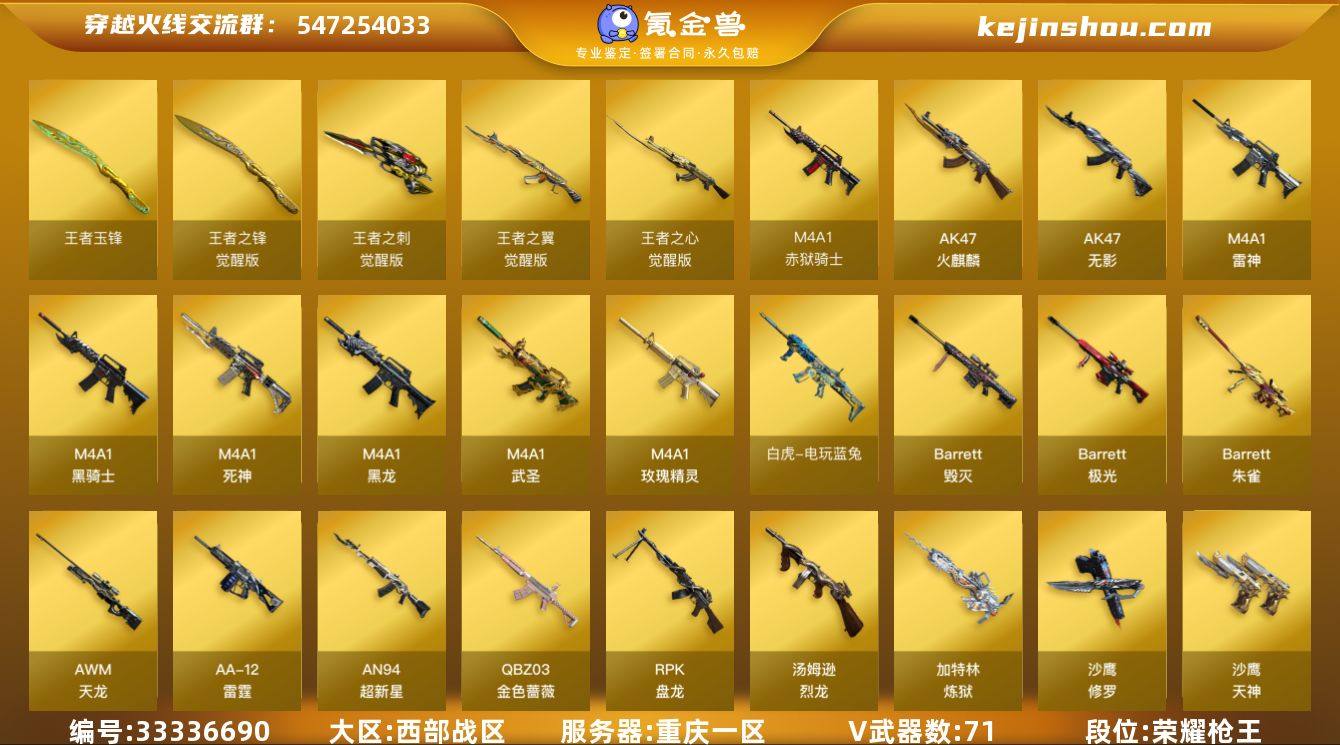重庆一区-77V-5王者武器数-0炫金武器数 【热门武器】:QBZ03-金色蔷薇,M200-竞技荣光,荣耀世冠-火麒麟,荣耀世冠-雷神,白虎-电玩蓝兔,荣耀世冠-柯尔特,M4A1-黑骑士,汤姆逊-烈龙*6,RPK-盘龙,加特林-炼狱,USP-雷暴,沙鹰-修罗*5,Knife-冠军之刃 【王者炫金武器】:王者玉锋 【音效卡】:AK47-火麒麟音效卡,M4A1-雷神音效卡,M4A1-黑骑士音效卡,Barrett-毁灭音效卡,QBZ03-金色蔷薇音效卡 【皮肤】:QBZ03-冠军之薇,雷神-暗月,雷神-荣耀之魄,雷神-星空,雷神-虎将*2,雷神-耀金皮肤,雷神-冠军之魄,雷神-荣耀世冠AG,火麒麟-冠军之心,火麒麟-轻羽皮肤,火麒麟-荣耀世冠AG,毁灭耀金皮肤,毁灭-冠军之怒,毁灭-BEAN-2020MVP,黑龙-能量核心,黑骑士-冠军之势,黑骑士-电玩青兔皮肤,无影-能量核心*2,天启-暗月,天龙-能量核心,AWM-天龙-传奇70KG,AWM-天龙-传奇白鲨,极光-能量核心*2,修罗-能量核心*4,天神-暗月*2,屠龙-荣耀世冠AG 【角色】:电竞教官-云悠悠,零·纪元,战地猎狐,不败狙神,奇洋探员,乔伊教练,修道士,云海玲珑,暗夜-X,风暴女,嘉年华灵狐,零-水下丽影,麻雀,曼陀罗-X,铁骑荣耀 【人偶武器】:天龙-曼陀罗,AWM-灵狐-15周年嘉年华...
