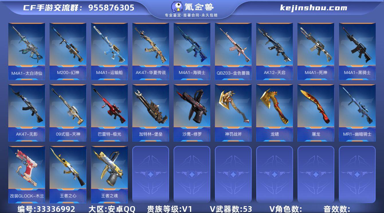 【QZQH131】VIP1/53V/王者之心/王者之魂/王者之尊/M200-幻神/AK47-无影/AK47-华夏传说/AK47-木兰/AK47-谜城烟火/M4A1-黑骑士/M4A1-死神/M4A1-海骑士/M4A1-运输船/M4A1-太白诗仙/AK12-天启/QBZ03-金色蔷薇/G36-李星云/AWM-大湾溢彩/巴雷特-极光/09式狙-天神/MR1-幽暗骑士/加特林-堡垒/沙鹰-修罗/改装GLOCK-木兰/龙啸/神罚战斧/屠龙/火麒麟手雷/高爆手雷-无限/高爆手雷-幻灵/闪光弹-游骑兵/烟雾弹-游骑兵/燃烧弹-游骑兵