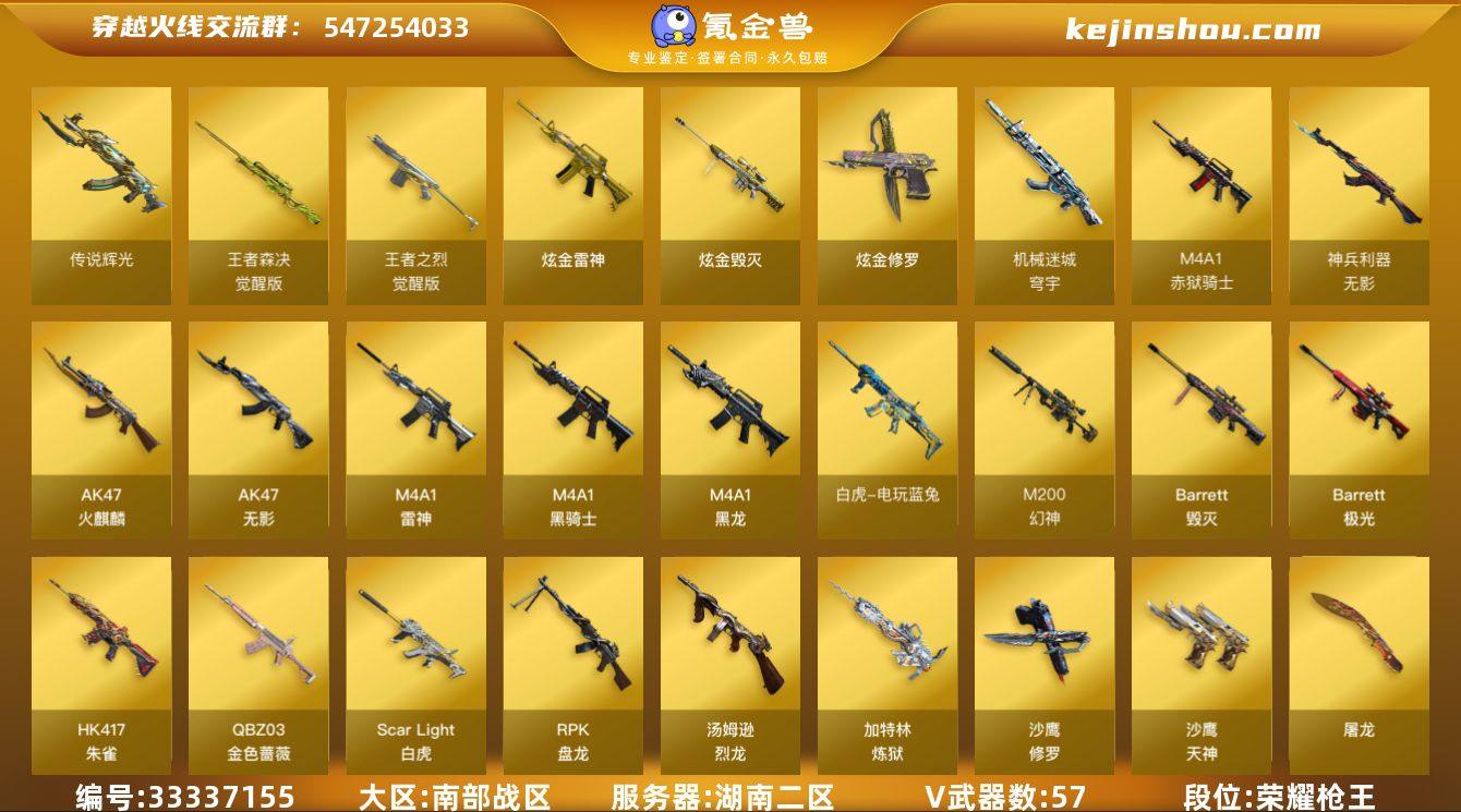 湖南二区-64V-3王者武器数-4炫金武器数 【传说武器】:传说辉光 【热门武器】:传说辉光,QBZ03-金色蔷薇,Scar Light-白虎,HK417-朱雀,M4A1-青龙,M200-幻神,M200-竞技荣光,死亡之眼,白虎-电玩蓝兔,柯尔特-冠军之特,M4A1-黑骑士*2,汤姆逊-烈龙*6,RPK-盘龙*4,加特林-炼狱*2,斯泰尔-蝴蝶,羊驼玩偶,沙鹰-修罗,Knife-冠军之刃 【王者炫金武器】:炫金雷神,炫金毁灭,炫金修罗*2 【音效卡】:M4A1-雷神音效卡,M4A1-黑骑士音效卡,QBZ03-金色蔷薇音效卡,绝迹语音包,N9语音包 【皮肤】:M200-幻神-黄忠皮肤,QBZ03-冠军之薇,雷神-星空,M4A1-战神赵云,雷神-机甲刑天皮肤,雷神-脉冲核心,火麒麟-雷神,火麒麟-冠军之心,火麒麟-心动糖果,毁灭-冠军之怒,毁灭-战神张飞,毁灭-神秘黑洞皮肤,黑骑士-暗月,黑骑士-冠军之势,战神-流金岁月皮肤,极光-能量核心,修罗-冠军之魂*3,屠龙-荣耀之锋 【角色】:魅影,电竞教官-云悠悠,鹰,零·纪元,战地猎狐,不败狙神,王者葵-惊若翩鸿,王者沙漠玫瑰,乔伊教练,北极狐-X,初恋灵狐,芳心审判者,飞虎队-X,风暴女,虎妞,嘉年华灵狐,娟娟,葵-赛博朋克,龙儿,龙儿-小淘气,曼陀罗-礼服,潘多拉-X,潘多拉-甜心教...